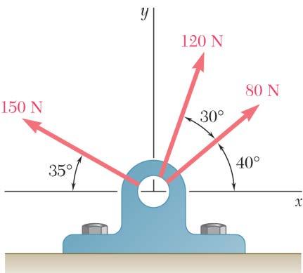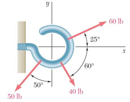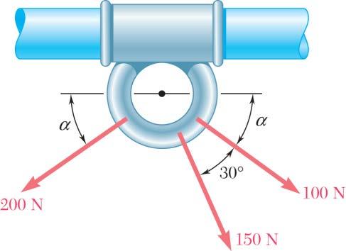 For the collar loaded as shown, determine (a) the required value of α if the resultant of the three forces shown is to be vertical, (b) the corresponding magnitude of the resultant.