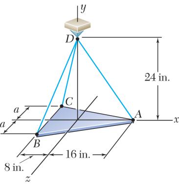 A 36-lb triangular plate is supported by three wires as shown. Determine the tension in each wire, knowing that a = 6 in.