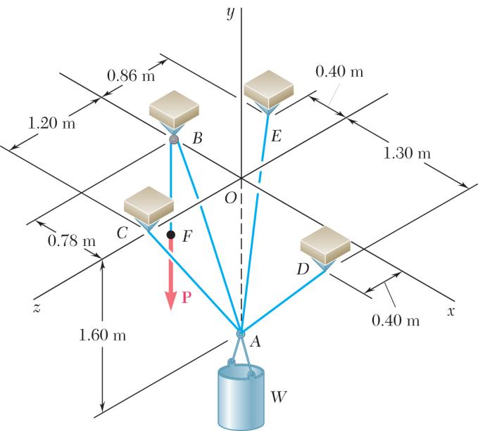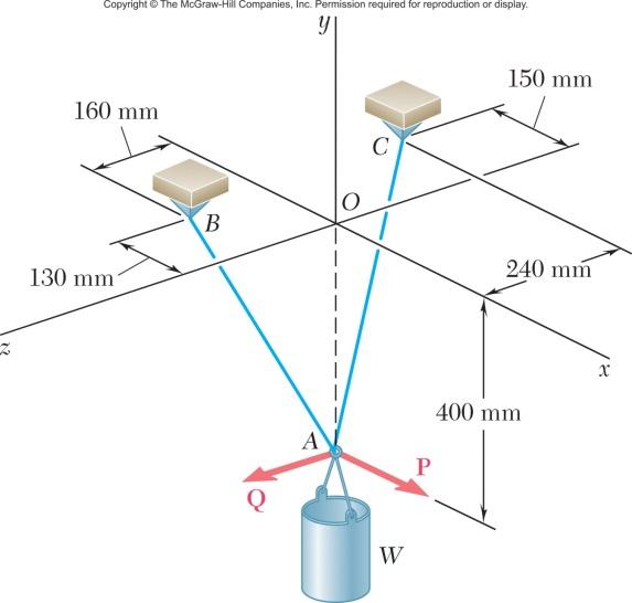 PROBLEM2.94 A container of weight W is suspended from ring A. Cable BAC passes through the ring and is attached to fixed supports at B and C. Two forces P = Pi and Q = Qk are applied to the ring to maintain the container in the position shown. Knowing that W 376 N, = determine P and Q. (Hint: The tension is the same in both portions of cable BAC.)