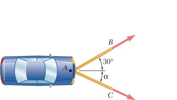 A disabled automobile is pulled by means of two ropes as shown. The tension in rope AB is 2.2 kN, and the angle α is 25°. Knowing that the resultant of the two forces applied at A is directed along the axis of the automobile, determine by trigonometry (a) the tension in rope AC, (b) the magnitude of the resultant of the two forces applied at A