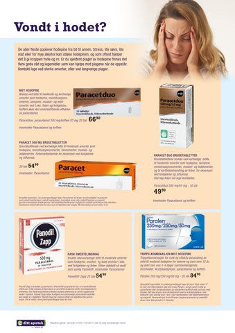 MOT HODEPINE Brukes ved lette til moderate og kortvarige smerter som hodepine, menstruasjonssmerter, tannpine, muskel- og leddsmerter ved f.eks. feber og forkjølelse. Koffein øker den smertestillende effekten av paracetamol. Paracetduo, paracetamol 500 mg/koffein 65 mg 20 tab