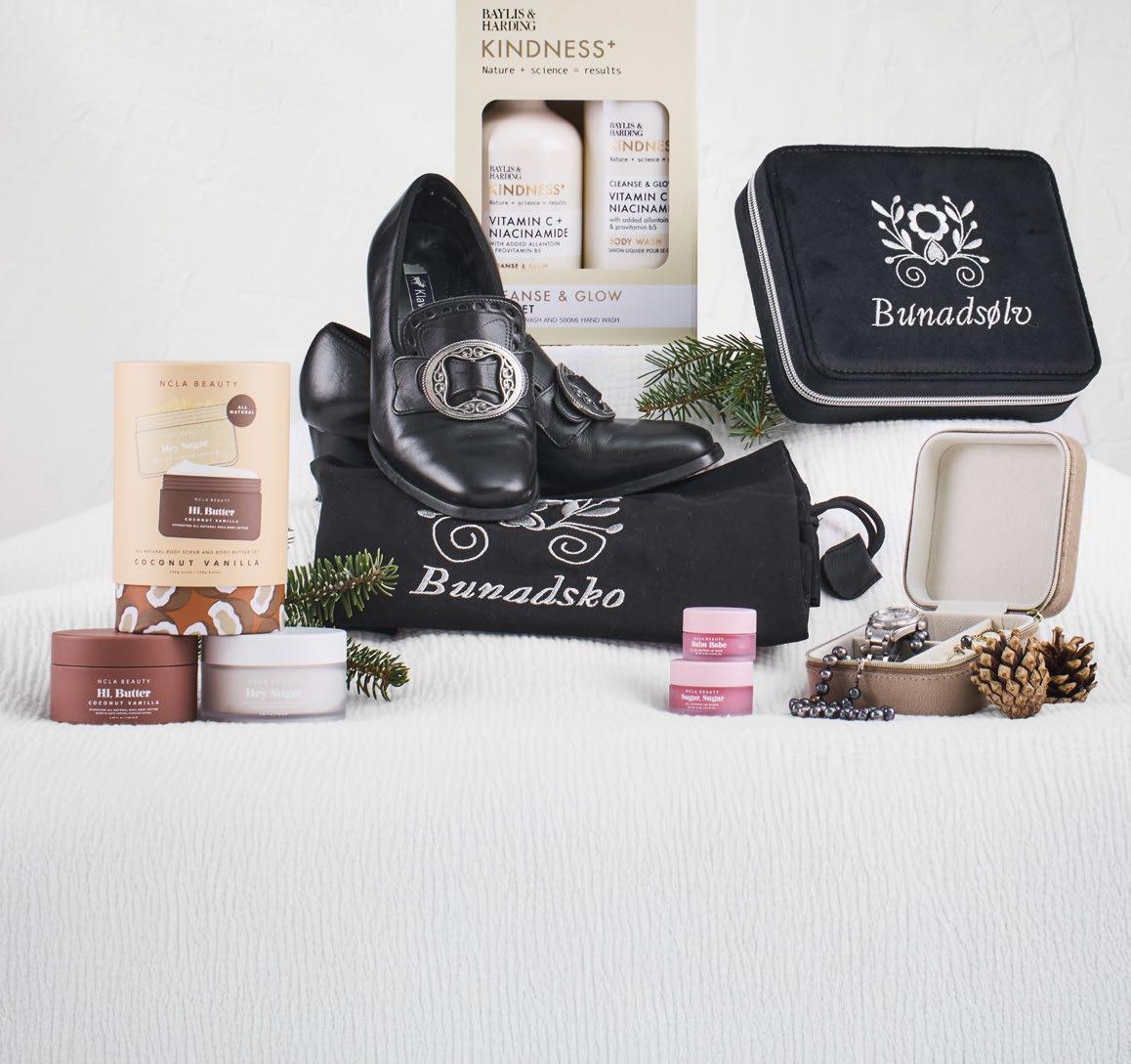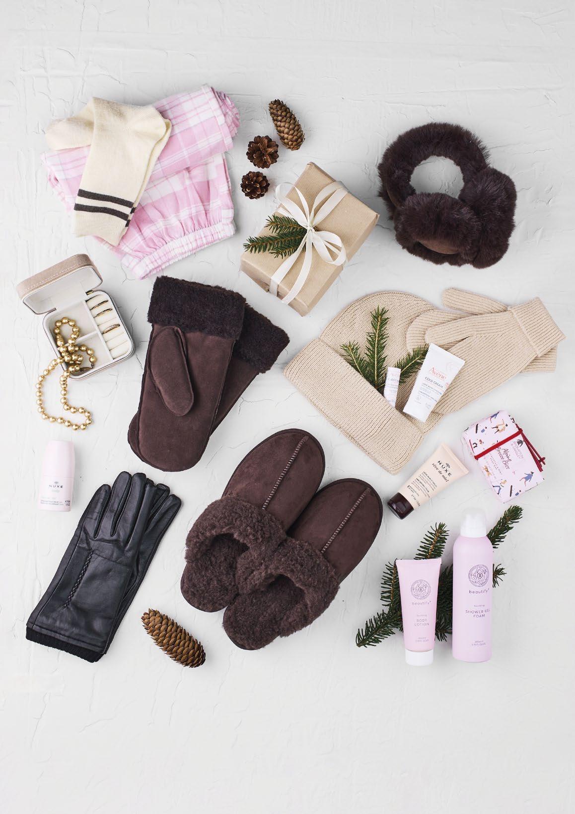 1. Ullsokker 3-pk sokker i myk og varm ullblanding med 60% ull. Kr 18990 • 2. Pysjbukse til dame Rutete hvit/lys rosa, str. S/M og L/XL. Kr 19990 3. Ørevarmer Trendy ørevarmer i brun farge. Kr 17990 • 4. Reisesmykkeskrin Beige velur, inkludert liten pose. Kr 22990 • 5. Votter med ullfôr One Size. Kr 19990 • 6. Avène Cold Cream Hand & Lip Populær klassiker, Lip Balm og Cold Cream (10 g + 50 ml). Kr 16990 • 7. Ullsett Delikat og varmt gavesett med creme-farget lue og votter i 60% ull og 40% akryl. Kr 24990 • 8. Brompton & Langley såpestykke Duft av eukalyptus & mint (250 g). Kr 9990 • 9. Nuxe Rêve De Miel gavesett Håndkrem og leppepomade (50 ml + 4 g). Kr 23990 • 10. Nuxe Rêve De Thé gavesett Dusjgelé og deodorant i gaveeske (200 ml + 50 ml). Kr 29990 • 11. Skinnhansker Hansker til dame i lammeskinn med ullfôr. One Size. Kr 24990 • 12. Tøfler Gode og varme tøfler med mykt ullfôr. Brune. Str 37-40. Kr 19990 • 13. Beautify Body gavesett Dusjskum og bodylotion (200 ml + 100 ml). Kr 17990