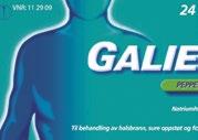 Galieve® tyggetabletter Reseptfritt legemiddel til behandling av halsbrann, sure oppstøt og fordøyelsesbesvær. Tyggetablettene danner sammen med magens saltsyre et lokalt beskyttende lag som legger seg over mageinnholdet og forhindrer surt mageinnhold å komme opp i spiserøret. Peppermyntesmak. 24 stk. Kr 15990