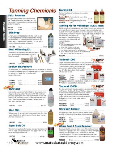 Tanning Kit for Wallhanger (TruBond 1000B) Tan like a professional taxidermist with TruBond’s new specially priced tanning kit. Everything you need to create a fine supple leather is included with enough ingredients to tan one large deer or 2 coyotes or 2-3 fox.Because these are the same high-quality products the pros use, you’re assured amazing results following our easy, step-by-step instructions. You just provide salt, water, and a skin. Includes: • 8 oz. Lipa-Solve 55 rehydrating bath solution for salted skins • 18 oz. Cirtic Acid for pickle bath • 8 oz. Lipa-Solve 77 for degreasing • 8 oz. Sodium Bicarbonate for neutralization • 16 oz. TruBond 1000B “paint-on” tan and leather oil • Easy, step-by-step tanning instructions