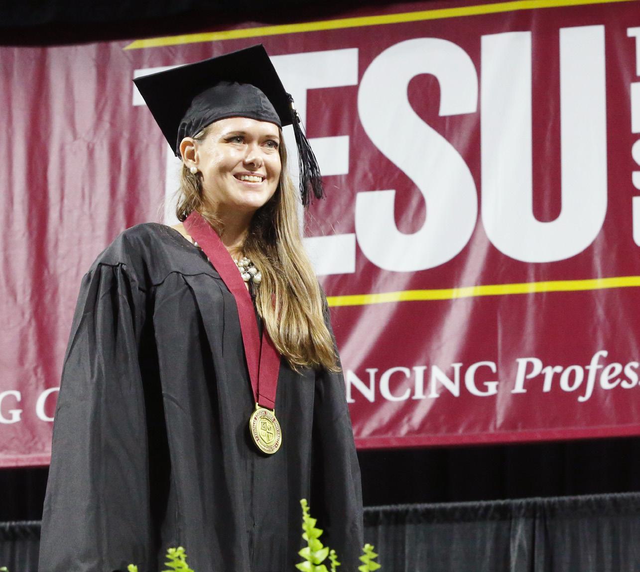 On left, Emily Barnes on stage at TESU’s 52nd Annual Commencement on Oct. 5. On right, Barnes and her husband, Phil.