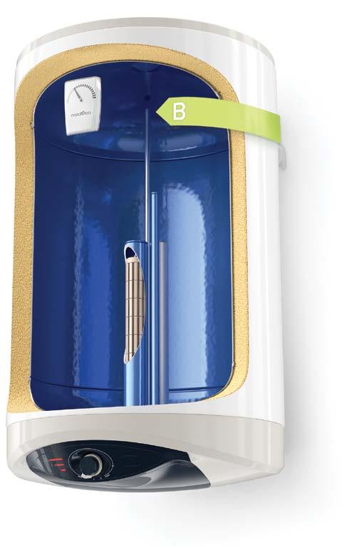 ECO SMART operating mode helps reduce the electricity costs without sacrificing the amount of hot water or the user’s comfort. The software integrated into the electronic control, similarly to an artificial intelligence, independently tracks and memorises the habits of the user, thus creating a time schedule and managing the appliance’s operation. This ensures hot water exactly when it is needed.