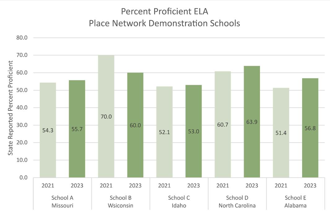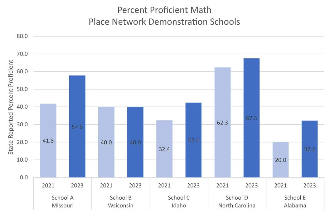 The impact of place-based education on test scores is a key concern for many. Our data reveals promising outcomes: all five Place Network Demonstration Schools either maintained or increased the proportion of students achieving "proficient" scores in math. Additionally, four of these schools saw similar improvements in English/Language Arts. The Place Network Learning Framework’s focus on "Integrating Content and Place" is designed to boost student success, illustrating the effectiveness of this approach in supporting academic achievement.