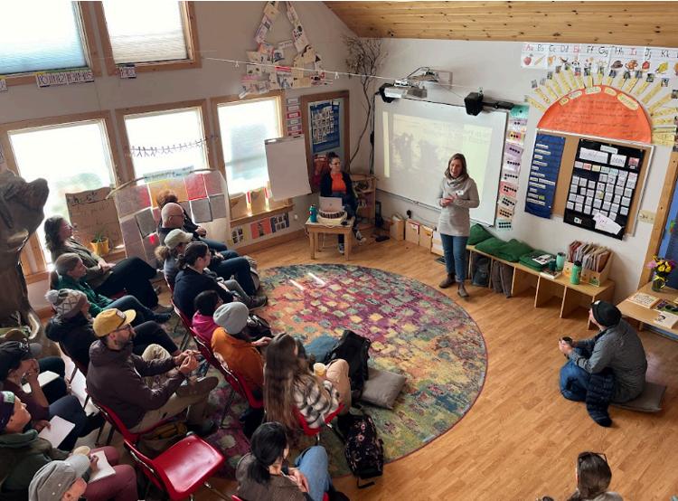 In this photo Katie Rose Griffith engages participating educators about how to connect environments, curriculum, and permaculture design in early childhood education. Katie Rose is an In Mud workshop facilitator and educator at Mountain Academy’s Teton Valley Campus.