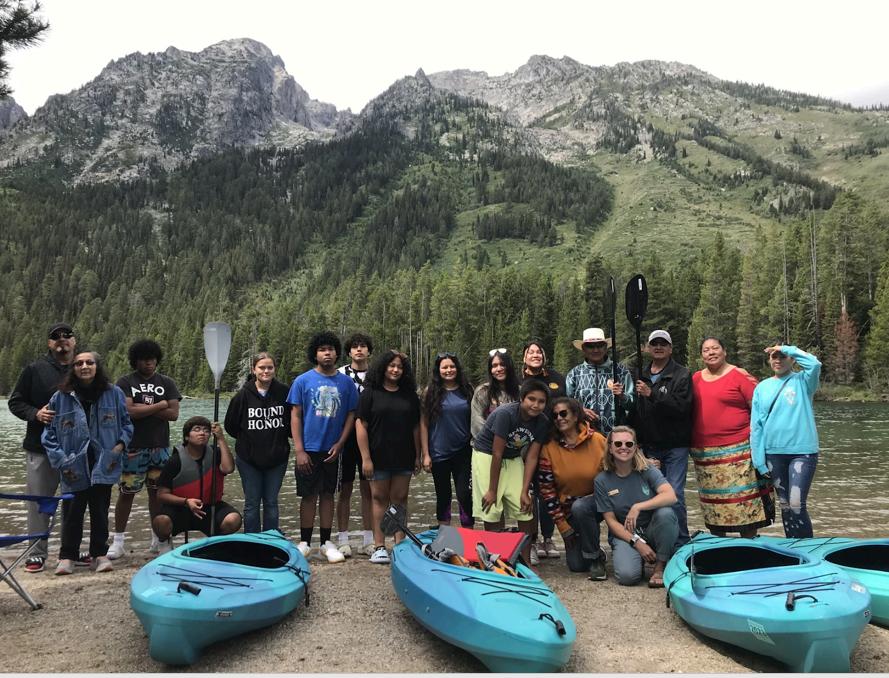 A group of young Native leaders attended a week-long trip to Grand Teton and Yellowstone National Parks in August, 2023. Organized by Indigenous Youth Voices, the trip included thirteen youth from the Wind River and Pine Ridge Reservations, and five elders and teachers from Native Nations. While on the program, the group toured Yellowstone National Park with Wildlife Expeditions of Teton Science Schools, visited String Lake, and rafted in the Snake River. The youth and elders stayed at the Kelly Campus of Teton Science Schools.