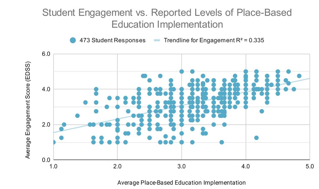 Our most recent data suggests that teachers who are using more placebased education generally report a higher overall sense of well-being across dimensions such as self-efficacy, affect, the quality of teacher-student interactions, and finding meaning in the work that they do. Our team is committed to investigating this relationship with further evaluation.