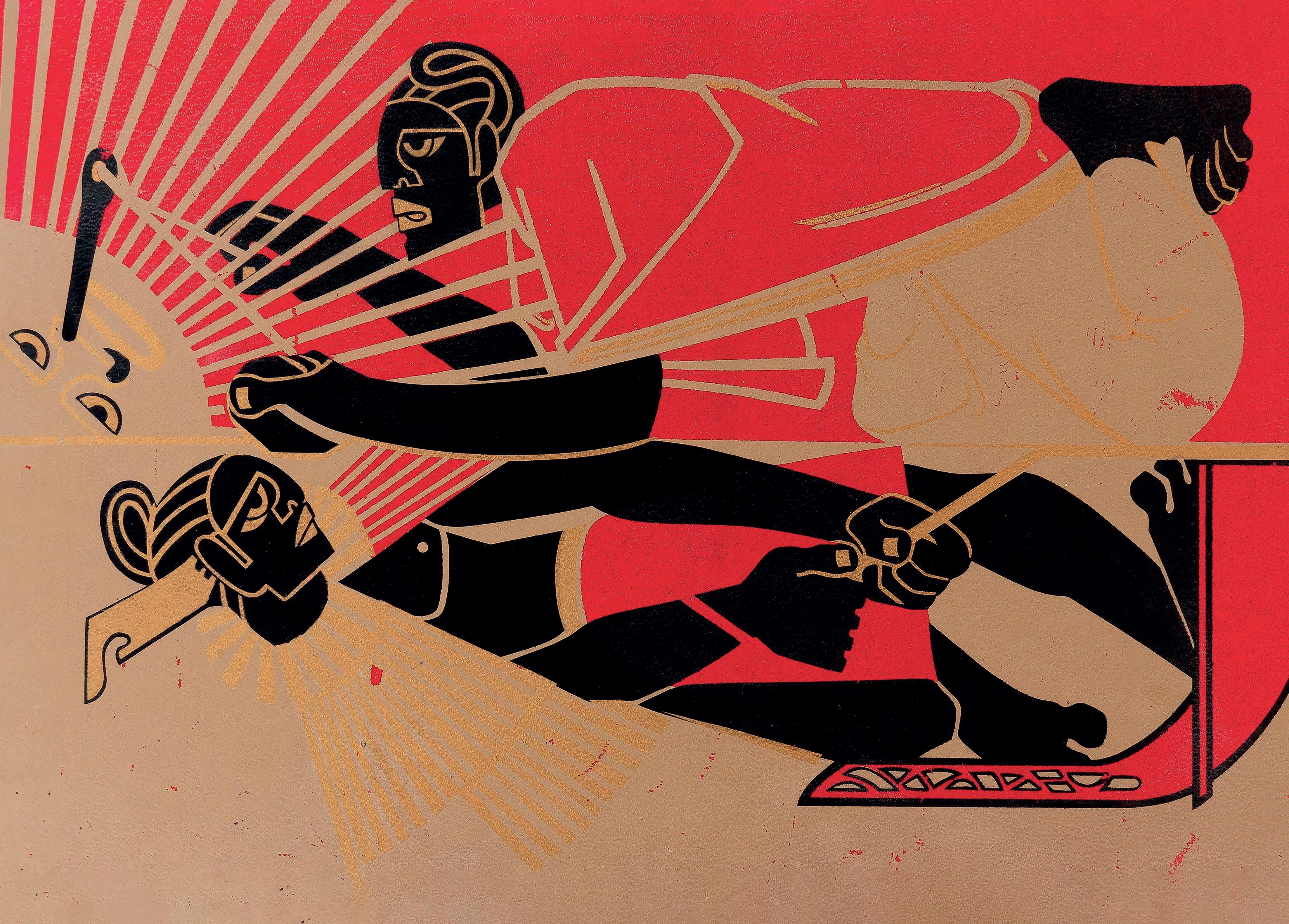 This is a menu cover which Yearbury designed for The Golden Room at the Golden Shears Motor Inn in Whakaoriori Masterton. It depicts Māui enacting two of his wondrous feats: slowing the sun’s progress across the sky and fishing up Te Ika-a-Māui, using the powerful jawbone of his ancestor Muri-ranga-whenua.