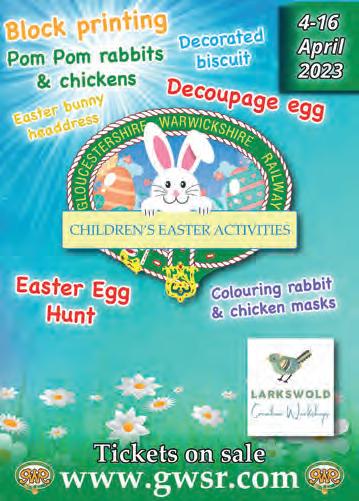easter egg hunt and creative workshops - plus, of course, steam and heritage diesel train rides along the awardwinning line from Broadway to Cheltenham Race Course.For timetables and tickets see www.gwsr.com