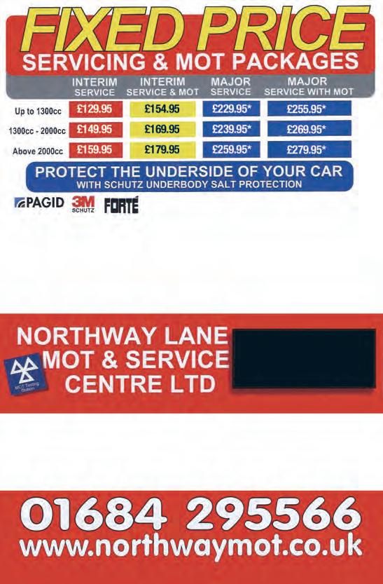 0 A GOOD MEASURE SHOULD YOU NEED ONE - SIZES IN CM/MM 123456789 10 11 1213 14 151617 18 19 20 21 22 23 24 2526 27 52 - TEWKESBURY DIRECT 01242 621346 • tewkesburydirect.co.uk tewkesburydirect@googlemail.com © Published by Tewkesbury Direct, 3 Station Cottages, Toddington GL54 5DT. Reproduction strictly prohibited without the prior permission of the publishers SUMMER MOTORING SERVICING and MOTs TYRES, EXHAUSTS & BRAKES including FREE tyre and brake checks CAR REPAIRS and fault diagnostics AIR-CONDITIONING Re-gassing FREE Summer Motoring Checks FREE Courtesy Car or Collection & Delivery Open:Mon-Fri 08.00-18.00 Saturday 08.30-12.30 Sun Closed 01684 296999 www.twyninggarage.co.uk email: enquiries@twyninggarage.co.uk Main A38, Shuthonger, Tewkesbury GL20 6EH Free tea and coffee always on the go at Natton Garage Open Mon-Thurs 8.30am-5.30pm Fri 8.30am-5.00pm Saturdays by appointment Servicing and Repairs While-u-Wait MOTs £45 cars £25 bikes All makes and models undertaken All our work is carried out to manufacturer specification by fully trained technicians Natton Garage and MOT Centre, Natton Lane, Ashchurch, Tewkesbury GL20 7BG