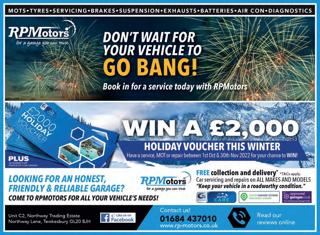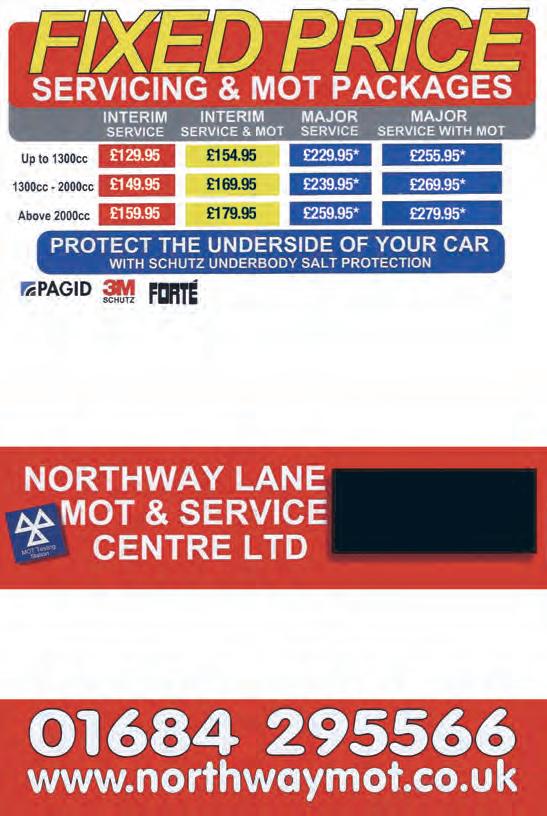 0 A GOOD MEASURE SHOULD YOU NEED ONE - SIZES IN CM/MM 123456789 10 11 1213 14 151617 18 19 20 21 22 23 24 2526 27 56 - TEWKESBURY DIRECT 01242 621346 • tewkesburydirect.co.uk tewkesburydirect@googlemail.com ©Published by Tewkesbury Direct, 3 Station Cottages, Toddington GL54 5DT. Reproduction strictly prohibited without the prior permission of the publishers AUTUMN MOTORING SERVICING and MOTs TYRES, EXHAUSTS & BRAKES including FREE tyre and brake checks CAR REPAIRS and fault diagnostics AIR-CONDITIONING Re-gassing FREE Autumn Motoring Checks FREE Courtesy Car or Collection & Delivery Open:Mon-Fri 08.00-18.00 Saturday 08.30-12.30 Sun Closed 01684 296999 www.twyninggarage.co.uk email: enquiries@twyninggarage.co.uk Main A38, Shuthonger, Tewkesbury GL20 6EH Free tea and coffee always on the go Open Saturdays 9.00am-1.00pm Natton Garage and MOT Centre Natton Lane, Ashchurch Tewkesbury GL20 7BG Servicing and Repairs Classic Car and Bike Specialists Autumn Levels Check inc top ups £25 inc VAT While-u-Wait MOTs £49 cars £29 bikes Fully trained technicians - 47 years experience We always use the best products and oils that the car left the factory with