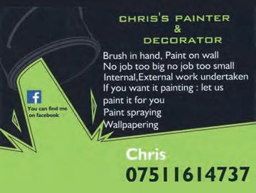 TEWKESBURY DIRECT - 53 DEDICATED PLASTERING PROFESSIONALS 01905 453417 or 07889 200177 • Plastering • Screeding • Ceilings • Partitions • Building Alterations • Rendering • Drywall etc • External Coatings • Free Quotes www ajbplastering.co.uk PAINTING & DECORATING PLASTERING TILING & DECORATING m 07761 503818 t 01452 780087 e andyedwardsdecorator @outlook.com Find us on Facebook GARDENING & LANDSCAPING FLATPACK FURNITURE ASSEMBLY FLATPAK-JAK 01684 274078 07788 164006 Email flatpakjak@btinternet.com Tewkesbury/Cheltenham/Gloucestershire-based Flat Pack Furniture Assembly From as little as £25.00 We assemble furniture from top suppliers: Wayfair, Argos, IKEA, Habitat and many other retailers A. G. BONIFACE & SONS LTD ELECTRICAL CONTRACTORS DOMESTIC & COMMERCIAL Rewires, extra sockets, lighting, consumer units All areas of electrical work Tel 01684 295754 Unit G4 Northway Trading Estate, Tewkesbury www.agbonifaceandsonsltd.co.uk DRAINAGE 24 Hour Emergency Call Out Based in Bredon Tel: 01684 438260 Email: williamrosedrains@outlook.com • Domestic/commercial blockages • Waste pipe unblocking • CCTV inspection/surveys • Environmental surveys • Drain installation, maintenance and repair • Septic tank installation and repair • Now NRSWA qualified ELECTRICAL SERVICES ELECTRICAL SERVICES TRADITIONAL PLASTERER 20 years experience Clean, tidy, reliable service All aspects of plastering and associated works undertaken For friendly and honest advice on your requirements Call Chris on 07970 883641 Covering all aspects of Painting and Decorating Services Including: Contact: Dan Bunt • 07410 114066 • walltofloor.com • Residential/Commercial and Lettings• Internal/Exterior • Wallpapering • Wallpaper and Paint Stripping • Damp Inspections and Treatments • Helping Hands Service • Property Snagging Inspections Domestics, Commercial • Inspection and Testing Kitchens, Bathrooms Outdoor Lighting and Power Jack Slatter 07532 400080 To advertise call 01242 621346 or visit www.tewkesburydirect.co.uk