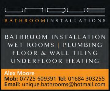 54 -TEWKESBURY DIRECT • 24 Hour Assistance • General Repairs • Maintenance • Minor Development Work Undertaken Electrical - Carpentry - Plumbing “Flexibility Is Our Strength” Premier Roofing Services All aspects of roofing work undertaken and completed to industry standards by professional tradesmen Office: (01684) 491802 Mobile: 07707 656487 Email:enquires.prs@gmail.com Providing roofing solutions across Gloucestershire. Contact us for free no-obligation advice and quotations We offer a comprehensive project timeline from start to finish and guarantee a competitive price ROOFING ROOFING PROPERTY MAINTENANCE PROPERTY MAINTENANCE SPECIALISING IN FLAT & PITCHED ROOFS EPDM RUBBER & GRP FIBREGLASS FASCIAS & GUTTERING CHIMNEY REPOINTING ROOF MAINTENANCE Mobile: 07776 003678 Email: sd.roofing@outlook.com FREE QUOTATIONS All work completed with a 20 or 25 year Guarantee Chimney Sweep/Stove Liner Installer • No Mess • No Dust • No Fuss • Fully insured • Bird Cowls Fitted • Certificate Issued • Rotary Power Sweeping • Traditional Sweeping • Smoke Test Every Sweep Stoves Serviced and Repaired Carbon Monoxide Alarms Fitted h 01684 296078 m 07718 605677 e ajschimneyservices@gmail.com PLUMBING & HEATING IS YOUR CHIMNEY SAFE? DOES IT LEAK? DOES IT NEED RE-BUILDING, RE-POINTING, REDUCING, CAPPING, COWLINGS, BIRDGUARDS, FLASHING REPAIRED/RENEWED FIREPLACE RESTORATION, ROOF REPAIRS EXTERNAL DECORATION UNDERTAKEN Ring THE CHIMNEY MAN now FULLY INSURED - C.I.T.B REGISTERED 01684 273538 Mobile 07801 700254 STOVES & CHIMNEYS Mike Spearing Heating Ltd Heating Systems. Boiler Replacements. LPG. Oil. Breakdowns. Servicing. Unvented. General Plumbing. Bathrooms. Tiling. Under Floor Heating. Power Flushing. Over 18 years experience in the trade including working as a Service Engineer for TOP boiler manufacturing company Worcester Bosch Up to 10 Years Guarantee on selected boilers. Full Public Liability Insurance. Gas Safe and Oftec Registered 01684 291622 • 07786 442500 www.mikespearingheating.co.uk To advertise call 01242 621346 or visit www.tewkesburydirect.co.uk