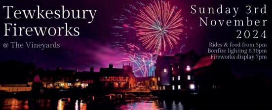 FIREWORKS - Sunday 3rd November,at The Vineyards. Organised by Tewkesbury Rotary Club - gates open 5pm, bonfire lit 6.30pm, fireworks at 7pm. Food stalls include hot dogs, chur-