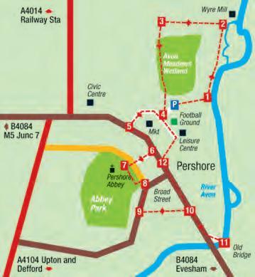 back to the car park, (4) then turn right to reach the road. Pershore Market is opposite. Turn right, and follow the road around to its junction with the High Street (5), and turn left. Cross the road with care, and turn right into Church Street (6) to walk down to Pershore Abbey.