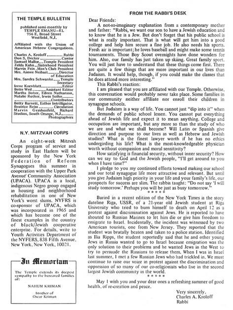• OCTOBER 20 “Salute to Israel” held at Temple to raise money for UJA Israel Emergency Fund in response to Yom Kippur War