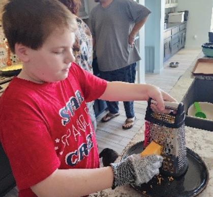 Here’s a safety tip when kids grate cheese. Now, yes, you can take the easy way out and buy the pre-grated cheese, but where’s the fun in that. We’re cooking, we’re teaching, it’s fun. Grab the grater. At our house we also have what we call the cheese glove. We picked it up in the kitchen section of an HEB, it’s a cut resistant glove. These things are wonderful. Have your child, or one of your children, put this on and grab the cheese.