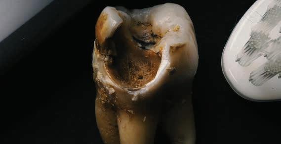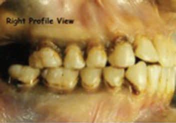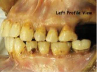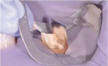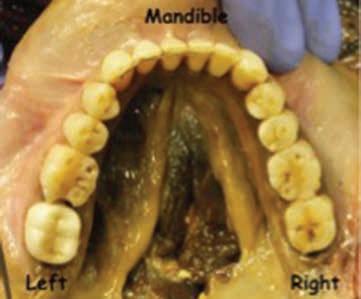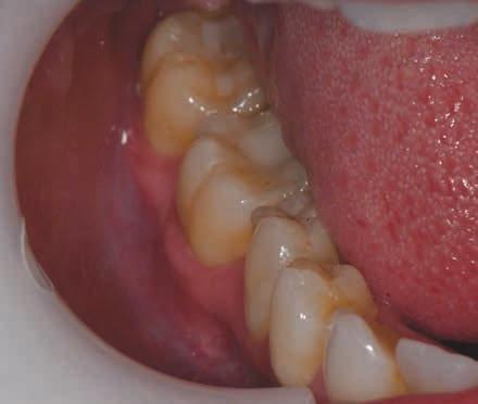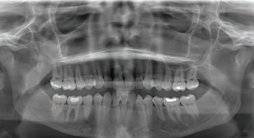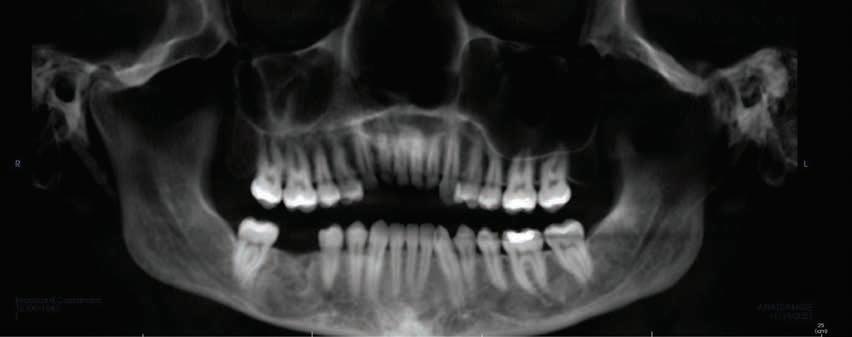 She returned to the clinic 3 years later for routine care and admitted to never having addressed the area or seeing the oral surgeon. A periapical radiograph revealed that the lesion had greatly expanded in size, and there was further resorption of the roots of #30 (Figure 2). Still, there was little evidence of expansion of the alveolus clinically at that time (Figure 3).