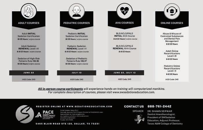 Our continuing education programs fulfill the TSBDE Rule 110 practitioner requirement in the process to obtain selected Sedation permits. AGD Codes for all programs: 341 Anesthesia & Pain Control; 342 Conscious Sedation; 343 Oral Sedation This is only a partial listing of sedation courses. Please consult our www.sedationce.com for updates and new programs. Two ways to Register: e-mail us at sedationce@aol.com or call us at 214-384-0796