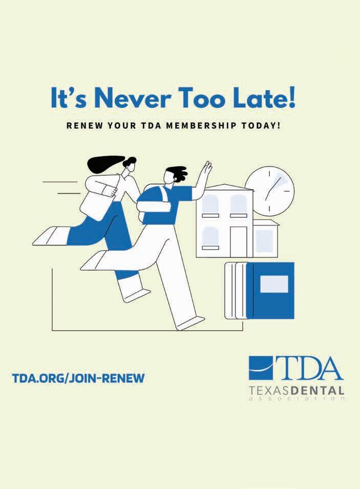 Texas Dental Journal (ISSN 0040-4284) is published monthly except January-February and August-September, which are combined issues, by the Texas Dental Association, 1946 S IH-35, Austin, TX, 78704-3698, 512-443-3675. PeriodicalsPostage Paid at Austin, Texas and at additional mailing offices. POSTMASTER: Send address changes to TEXAS DENTAL JOURNAL, 1946 S IH 35 Ste 400, Austin, TX 78704. Copyright 2023 Texas Dental Association. All rights reserved. Annual subscriptions: Texas Dental Association members $17. Instate ADA Affiliated $49.50 + tax, Out-of-state ADA Affiliated $49.50. In-state Non-ADA Affiliated $82.50 + tax, Out-of-state Non-ADA Affiliated $82.50. Single issue price: $6 ADA Affiliated, $17 Non-ADA Affiliated. For in-state orders, add 8.25% sales tax.