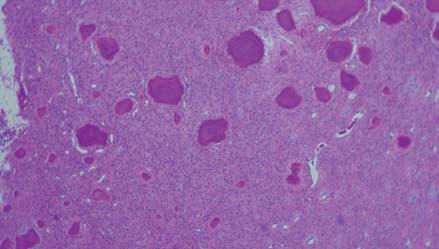Microscopic examination reveals a cellular tumor composed of bundles of plump to spindle cells set within a fibrous matrix. Mitotic figures are rare. Round calcifications exhibiting concentric ring lines were noted scattered throughout the lesional tissue (Figure 5).