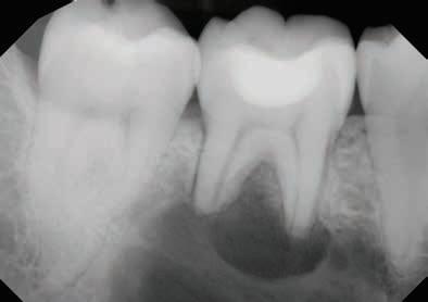 This case concerns a 39-year-old female patient who presents with an asymptomatic radiographic lesion discovered on a routine panoramic radiograph. A radiolucency was noted in the right posterior mandible in the furcation area of tooth #30. Also noted was spiking root resorption of the roots of #30 (Figure 1). The associated tooth was vital and non-mobile No