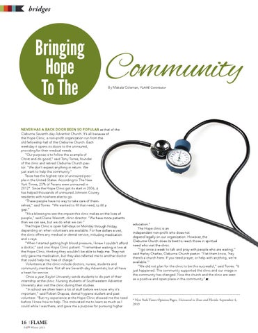 NEVER HAS A BACK DOOR BEEN SO POPULAR as that of the Cleburne Seventh-day Adventist Church. It’s all because of the Hope Clinic, a non-profit organization run from the old fellowship hall of the Cleburne Church. Each weekday it opens its doors to the uninsured, providing for their medical needs. “Our purpose is to follow the example of Christ and do good,” said Tony Torres, founder of the clinic and retired Cleburne Church pastor. “We don’t expect anything in return. We just want to help the community.” Texas has the highest rate of uninsured people in the United States. According to The New York Times, 25% of Texans were uninsured in 2012*. Since the Hope Clinic got its start in 2006, it has helped thousands of uninsured Johnson County residents with nowhere else to go. “These people have no way to take care of themselves,” said Torres. “We wanted to fill that need, to fill a gap.” “It’s a blessing to see the impact this clinic makes on the lives of people,” said Diane Wescott, clinic director. “We have more patients than we can see, but we do what we can.” The Hope Clinic is open half-days on Monday through Friday, depending on when volunteers are available. For five dollars a visit, the clinic offers any medical or dental service, including medication and x-rays. “When I started getting high blood pressure, I knew I couldn’t afford a doctor,” said one Hope Clinic patient. “I remember waiting in line at the Hope Clinic, thinking they wouldn’t be able to help me. They not only gave me medication, but they also referred me to another doctor that could help me, free of charge.” Volunteers at the clinic include doctors, nurses, students and community members. Not all are Seventh-day Adventists, but all have a heart for service. Once a year, Baylor University sends students to do part of their internship at the clinic. Nursing students of Southwestern Adventist University also visit the clinic during their studies. "In school we often learn a lot of stuff before we know why it's important,” said Robert Drapiza, dental hygiene student and past volunteer. “But my experience at the Hope Clinic showed me the need before I knew how to help. This motivated me to learn as much as I could while I was there, and gave me a purpose for pursuing higher