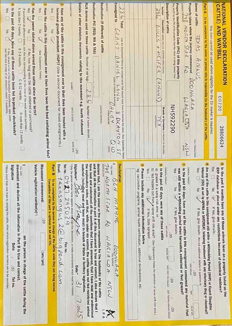 7. Transport – All transport coordination will be done through acting agent in conjunction with FALLS LIVESTOCK TRANSPORT immediately after the sale. Lachie Falls is the representative (Mobile 0429 826 342). Any client wishing to use their own or preferred transport is more than welcome to do so but MUST be coordinated through Lachie Falls immediately after the sale. Texas Angus recommends Falls Livestock Transport for long distance cartage.