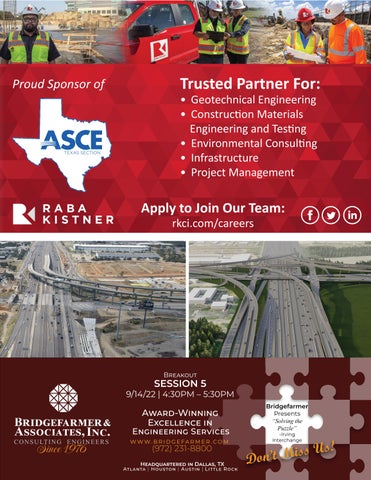 CECON 2022 Official Program Welcome ................................................................................ 3 ASCE Texas 2022 Board of Direction ............................. 5 Keynotes ................................................................................ 6 Panels ................................................................................... 11 Sponsors .............................................................................. 14 Conference Floor Plan ...................................................... 19 Schedule............................................................................... 20 Exhibitors ............................................................................. 26 Business Meeting .............................................................. 32 ASCE Texas 2023 Board of Direction ........................... 33 About ASCE Texas Section .............................................. 34 Executive Director Jenni Peters, CAE | jpeters@texasce.org Operations Specialist & Board Secretary Mike E. Sosa | msosa@texasce.org Communications Specialist Stephanie Huebinger Ludlow| sludlow@texasce.org (512) 472-8905 | www.TexASCE.org | office@texasce.org ASCE Texas Section Connect with #TexASCE