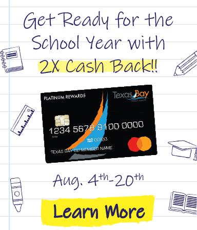 4. Get Cash Back. With your Texas Bay Platinum Rewards Mastercard, you will get double the points when you shop from August 4th - 20th! Use this cashback reward to help you pay for future expenses that the school year is sure to throw at you. Texas Bay also offers personal loans that can help you with back-to-school expenses. Whatever it is this year, we’ve got your back.