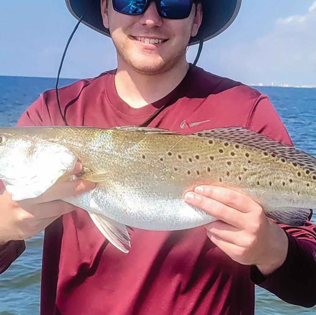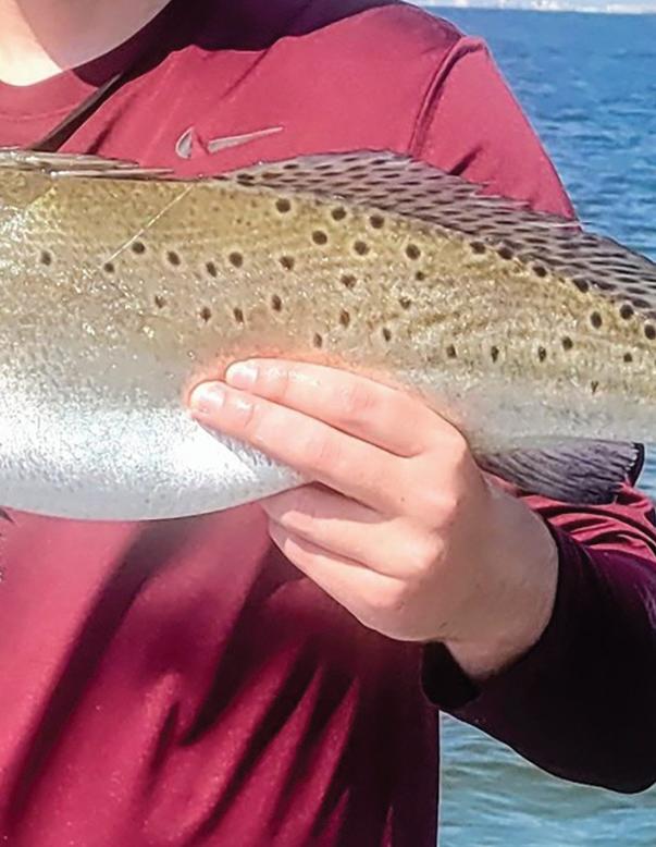 Cooper Emery Russell caught and released this sixpound trout while fishing with his dad, Emery Vinklarek at the Galveston jetties. The six-pounder was the third personal best for Cooper of the day.