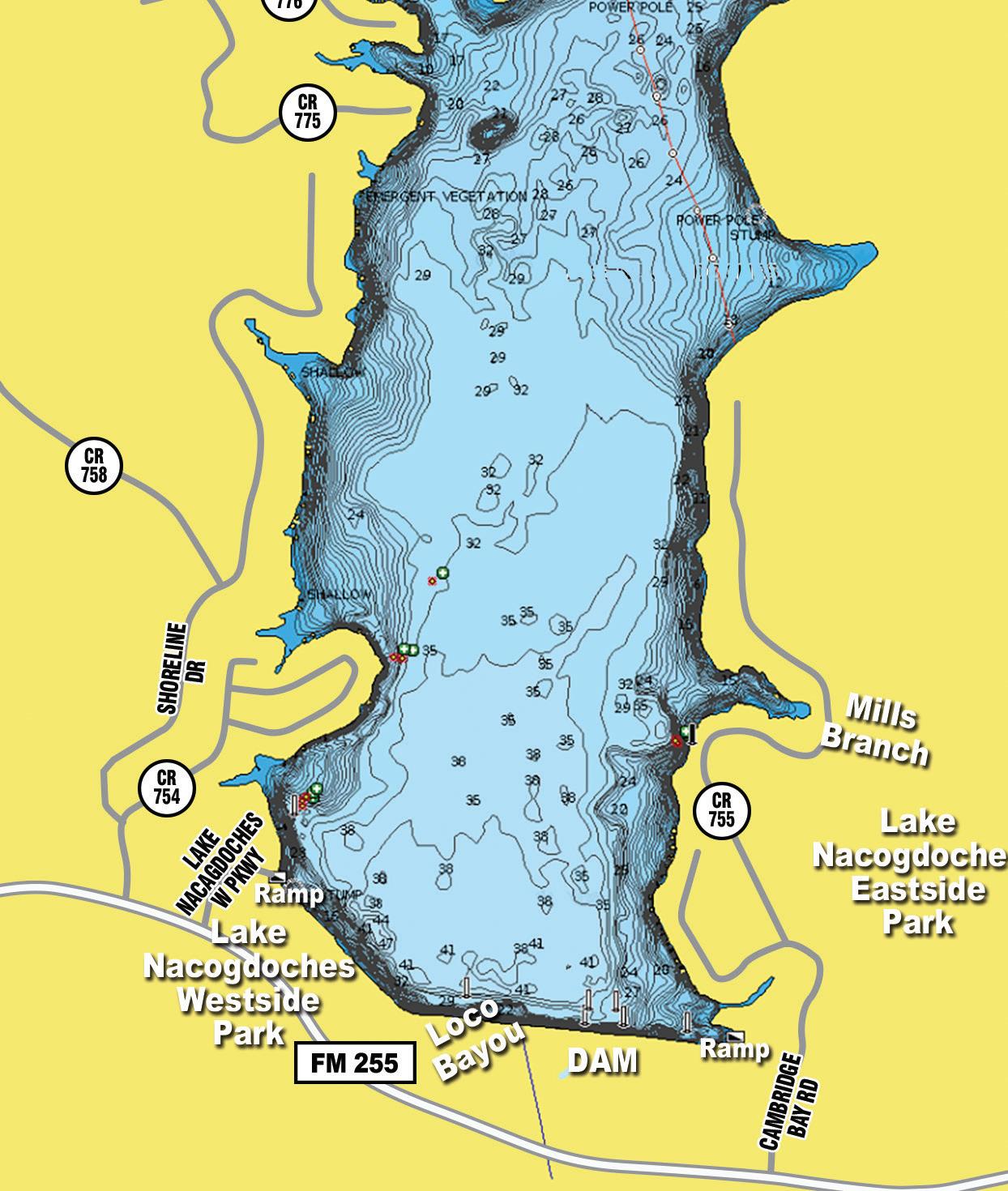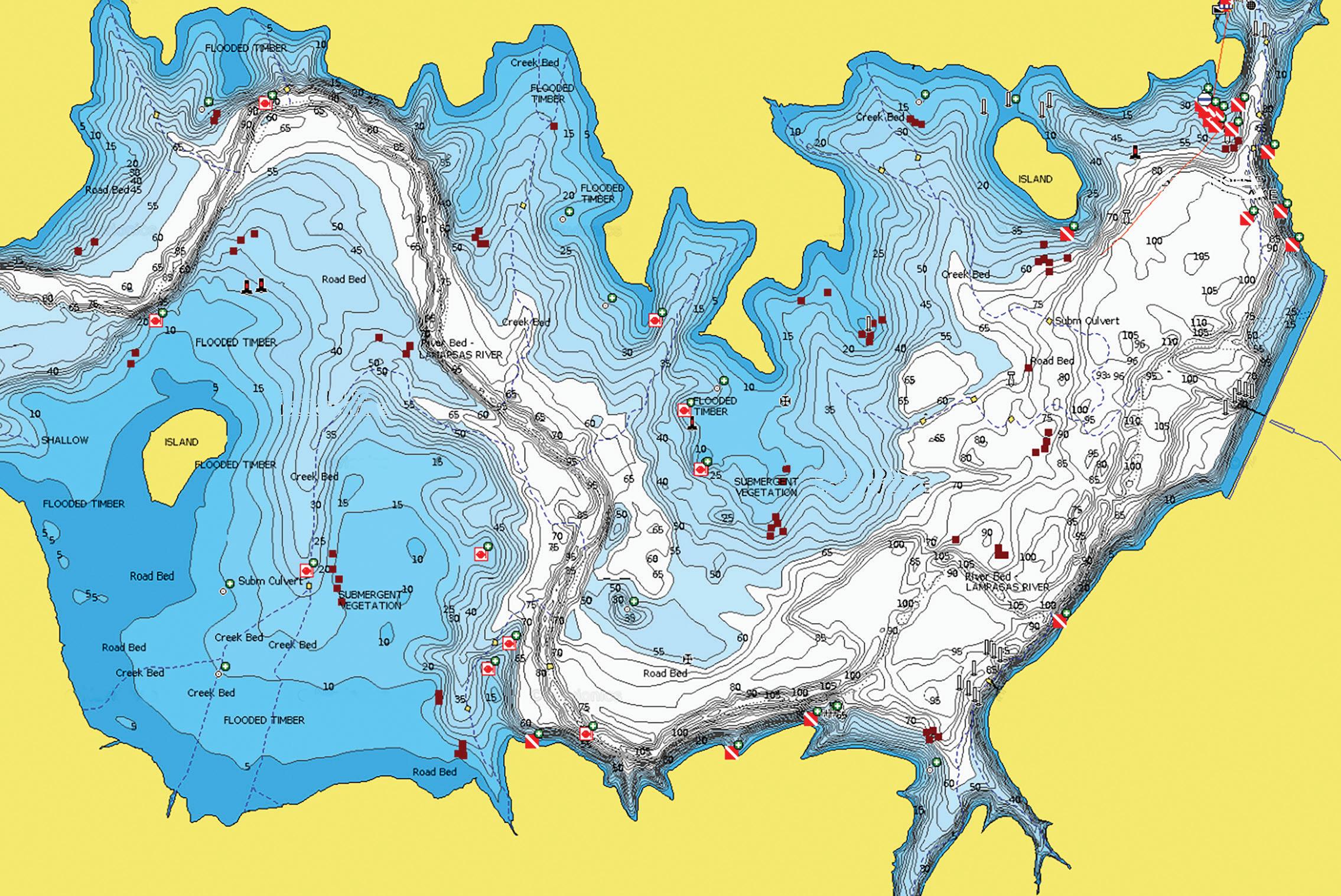 head also contains channel, blue, and flathead catfish. Largemouth bass fishing is good near the dam. Fish attractors have been installed in the area around the state park. See this symbol... ...on the map.