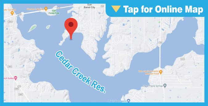 LOCATION: Cedar Creek Lake HOTSPOT: Main Lake GPS: N 32 18.906, W 96 9.72 (32.3151, -96.1620)