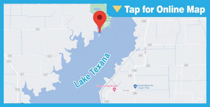 SPECIES: Largemouth Bass BEST BAITS: Spinnerbaits, crankbaits, and soft plastics SOURCE: Texas Lakes & Bays Fishing Atlas Fishgame.com/fi shgamegear TIPS: Generally, just before a front arrives and as the front is pushing in, fi sh become more active and feed much more aggressively. This secondary point has deep and shallow water along with brush. The brush extends into the cove and along the bank.
