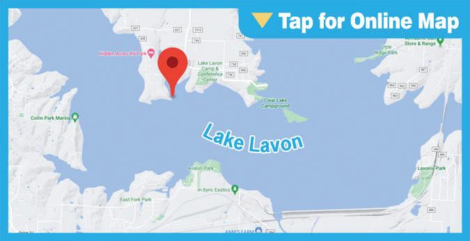 SPECIES: Hybrid Striped Bass BEST BAITS: Live shad, drift fi sh SOURCE: Texas Lakes & Bays Fishing Atlas Fishgame.com/fi shandgamegear TIPS: Live shad, drift fi sh; all day.