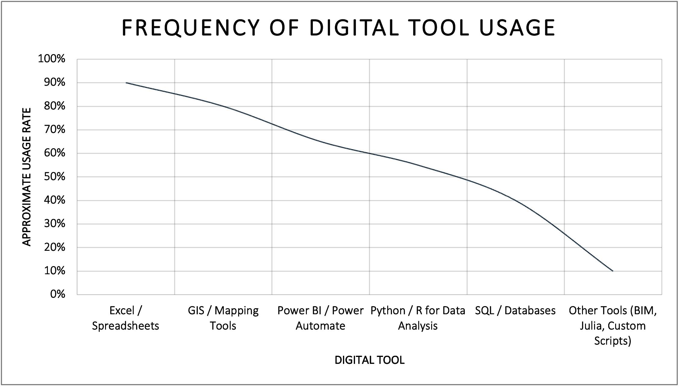 • Excel and GIS remain the dominant tools, though Python and Power BI are gaining traction among younger professionals.