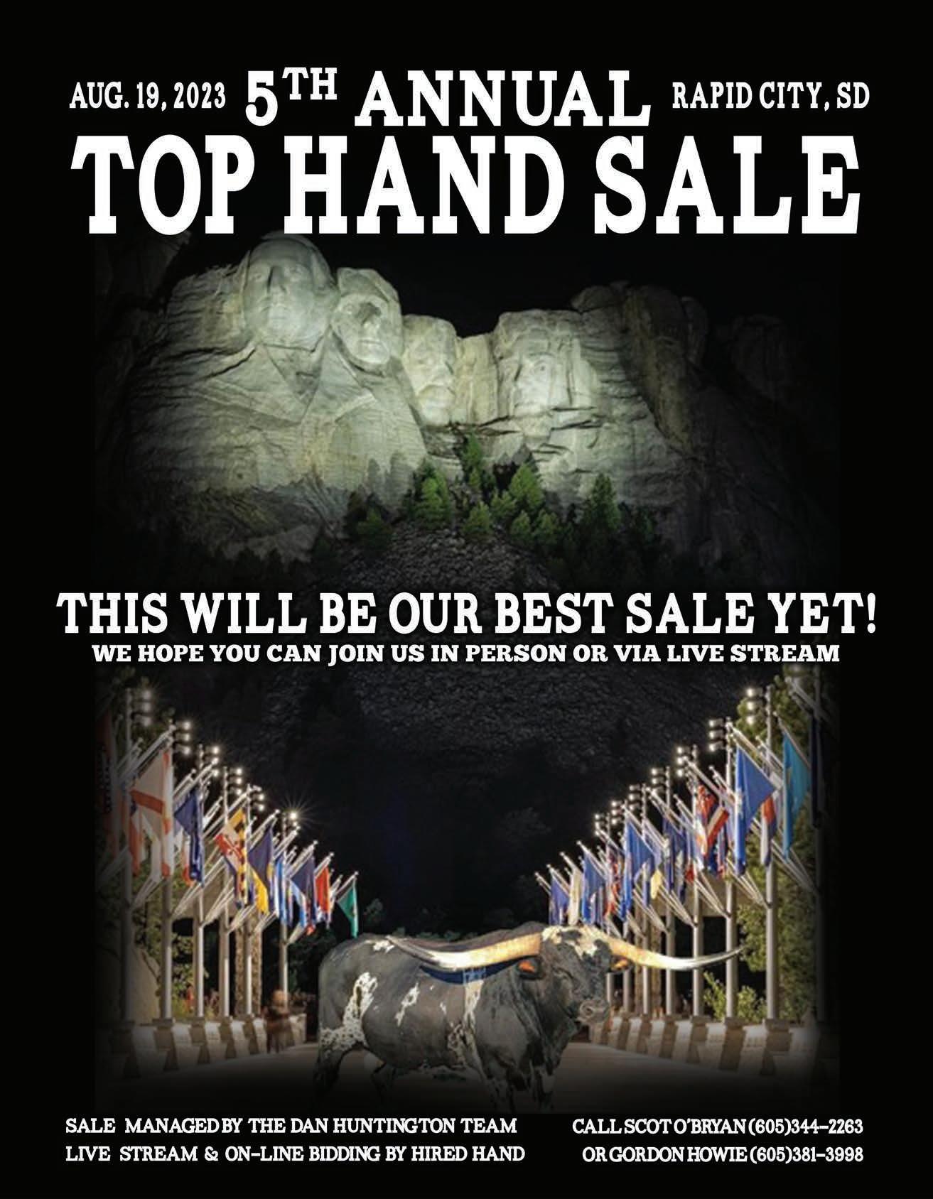 AUGUST 19 • 5th Annual Top Hand Sale, Central States Fair, Rapid City, SD. Contact Gordon Howie gkhowie@yahoo.com