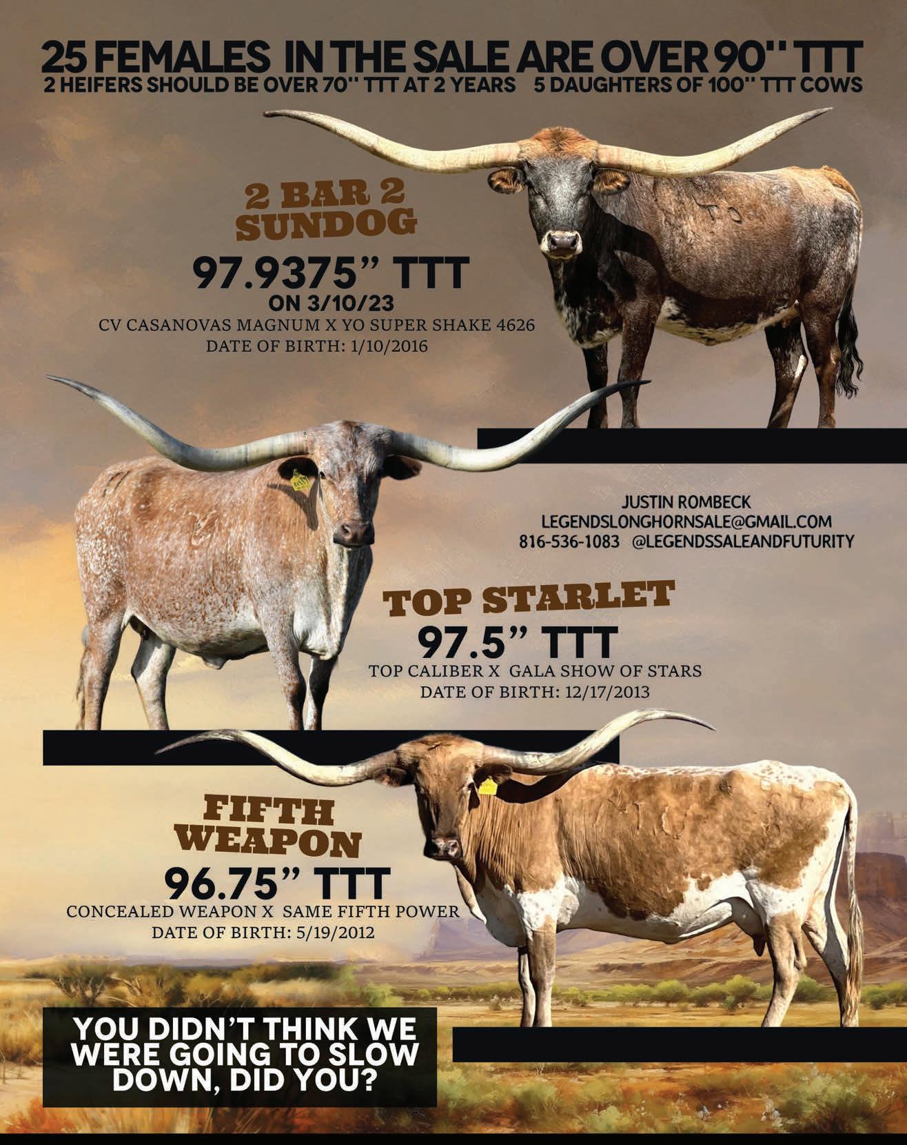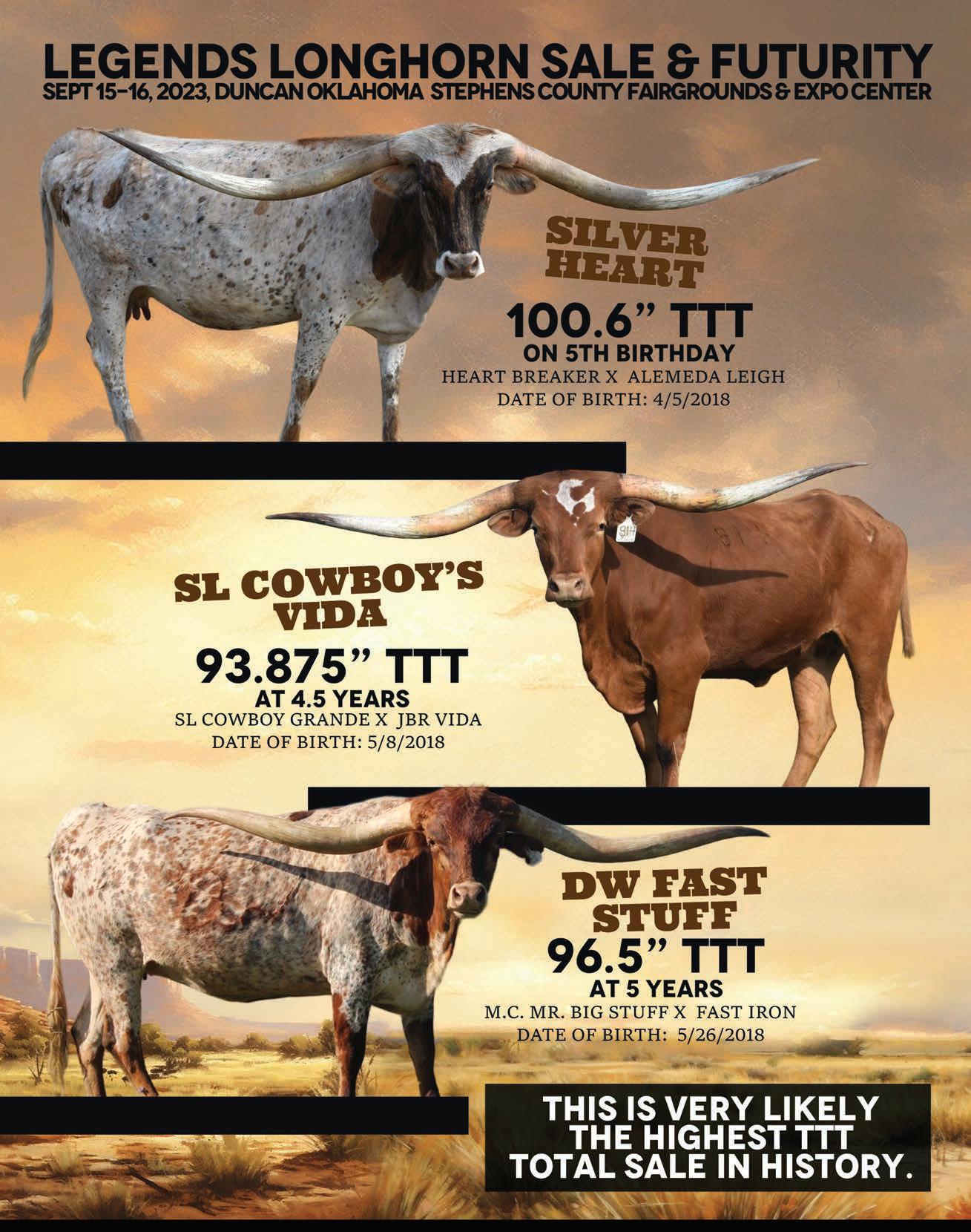 SEPTEMBER 15-16 • Legends Longhorn Sale & Futurity, Stephens County Fairgrounds, Duncan, OK Contact Justin Rombeck (816) 536-1083 or legendslonghornsale@gmail.com