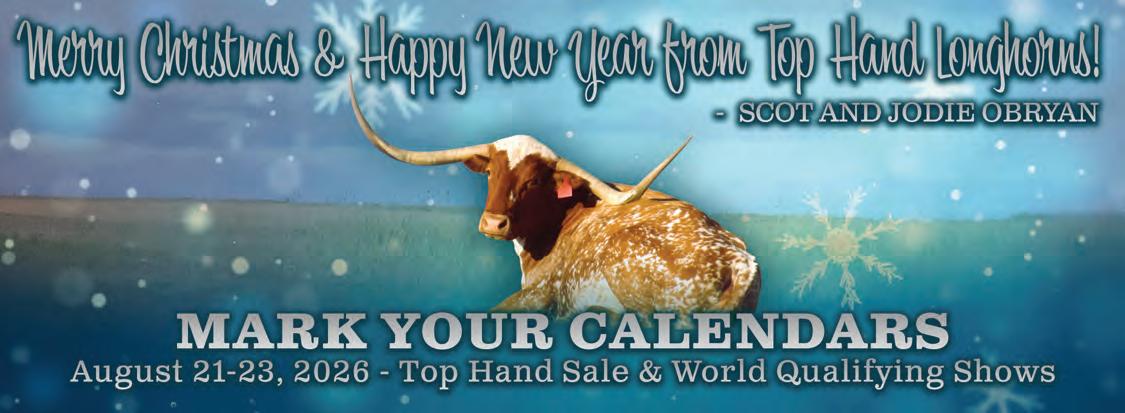 August 21-23, 2026 • Top Hand Longhorns Sale and World Qualifying Shows Rapid City, SD, Contact Jodie O’Bryan joband123@hotmail.com