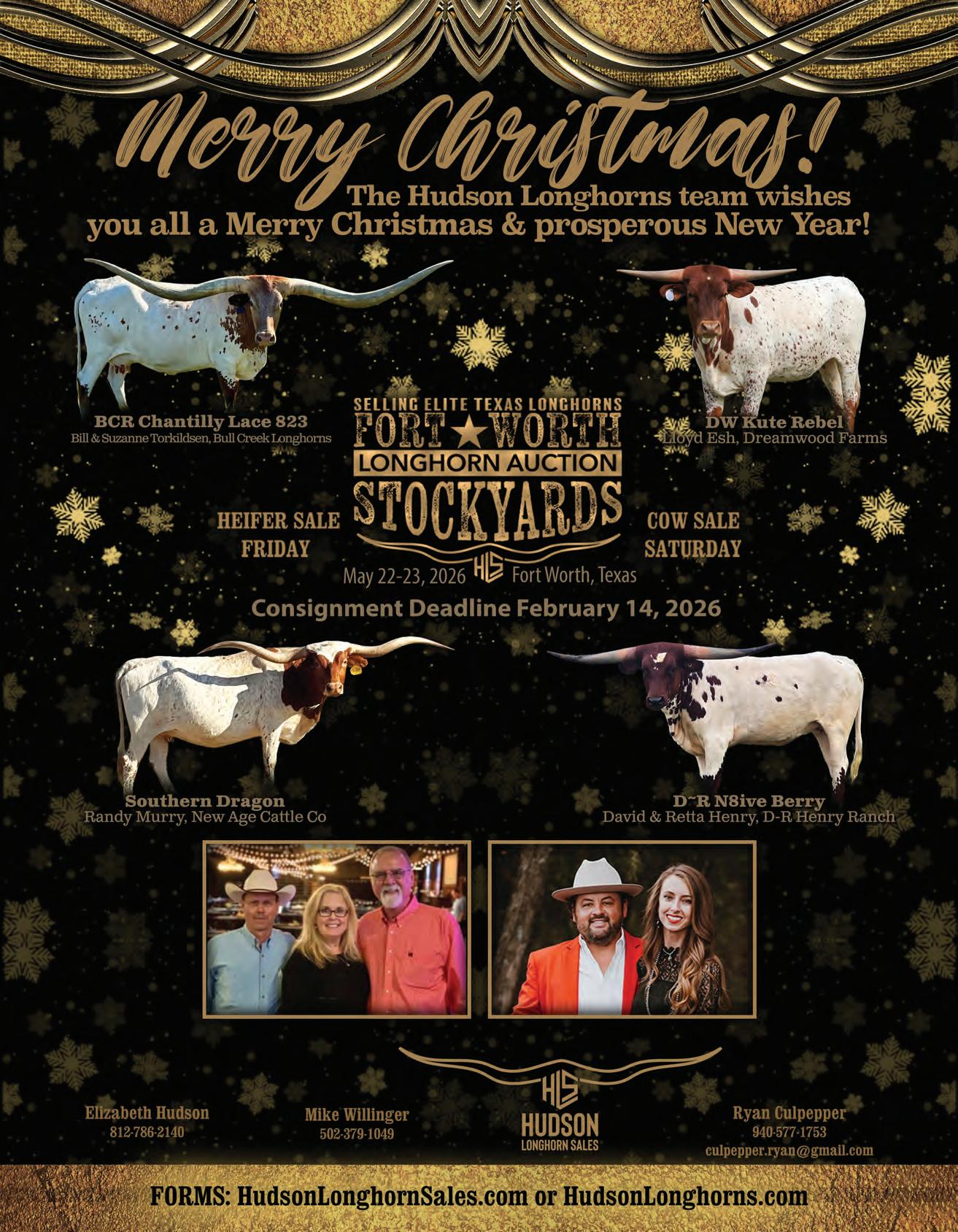 May 22-23, 2026 • Fort Worth Stockyards Longhorn Auction, Heifer Sale Friday - Cow Sale Saturday. Contact Hudson Longhorn Sales, Elizabeth Hudsonehudson18@gmail.com or (812) 786-2140.