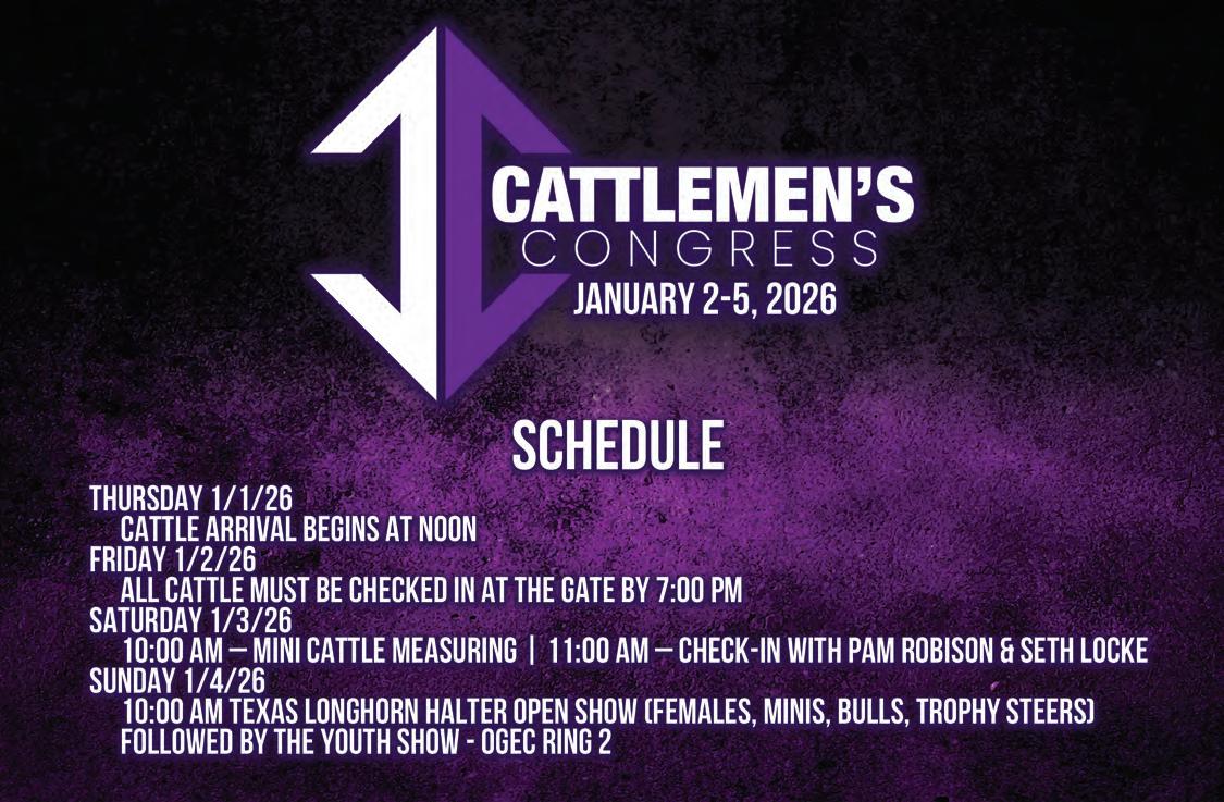 April 10-12, 2026 • ETLA Corsicana Classic, Navarro County Exposition Center, Corsicana, TX Contact Debbie Burkham dburk5@hotmail.com or 214-616-2549 Qualifying Haltered, Trophy Steers, Youth, Points Only or Miniatures.