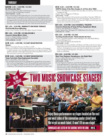 Enjoy these performances on stages located on the east and west sides of the convention center street level. We’ve got so much talent, it won’t fit on one stage! SHOWCASES ARE LISTED IN THE SCHEDULE WITH THE CODE: 36 Southwestern Musician | December 2013