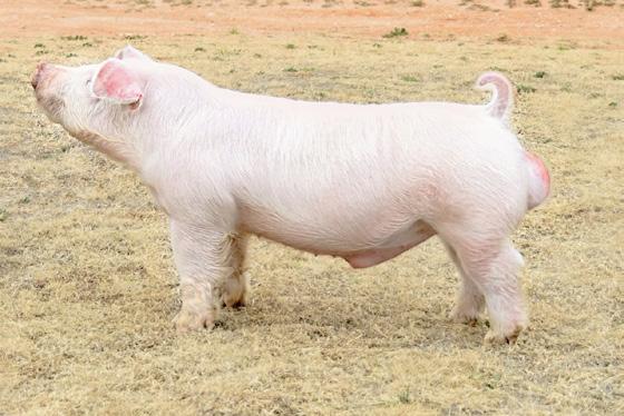 His first season we bred him to three sows. From those, he produced Blue Collar at Laird’s, our $35,000 consignment at The Established last Fall; the Champion Chester and Third Overall Chester Gilts at Texas Elite; the Reserve Chester Barrow at San Antionio; the Fourth Overall Chester Gilt at San Antonio; and several other premium sale barrows and top-placing gilts and barrows at shows in Texas. We continued to use him in Fall ‘24/Spring ‘25 and look forward to seeing what else he can accomplish in a limited number of matings. He generates just like his pedigree reads. He consistently adds feature, foot size, a loose skeleton, and a great rib cage with shape and muscle. Taken to taller shouldered sows with extra look up front, it’s lights out good!
