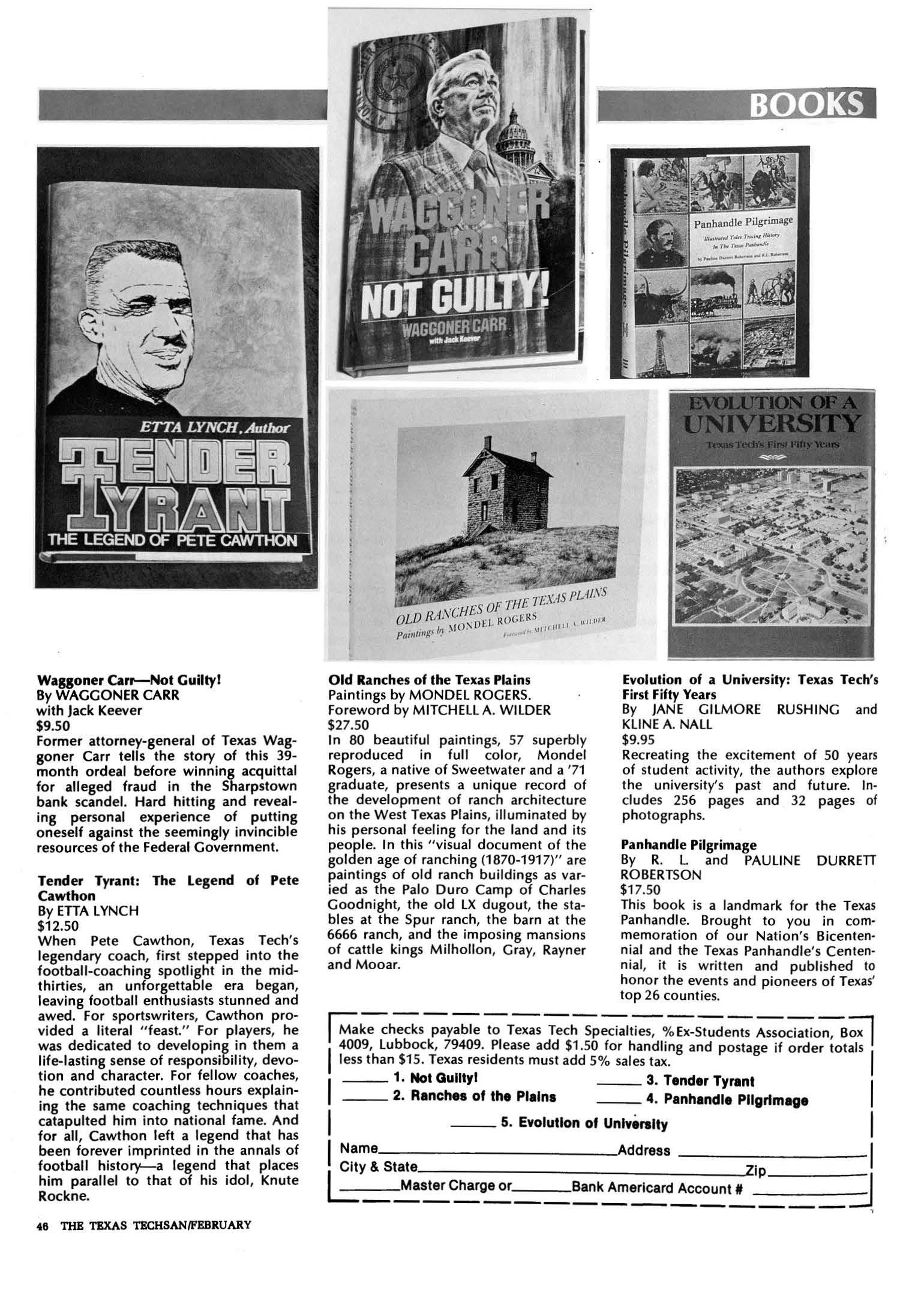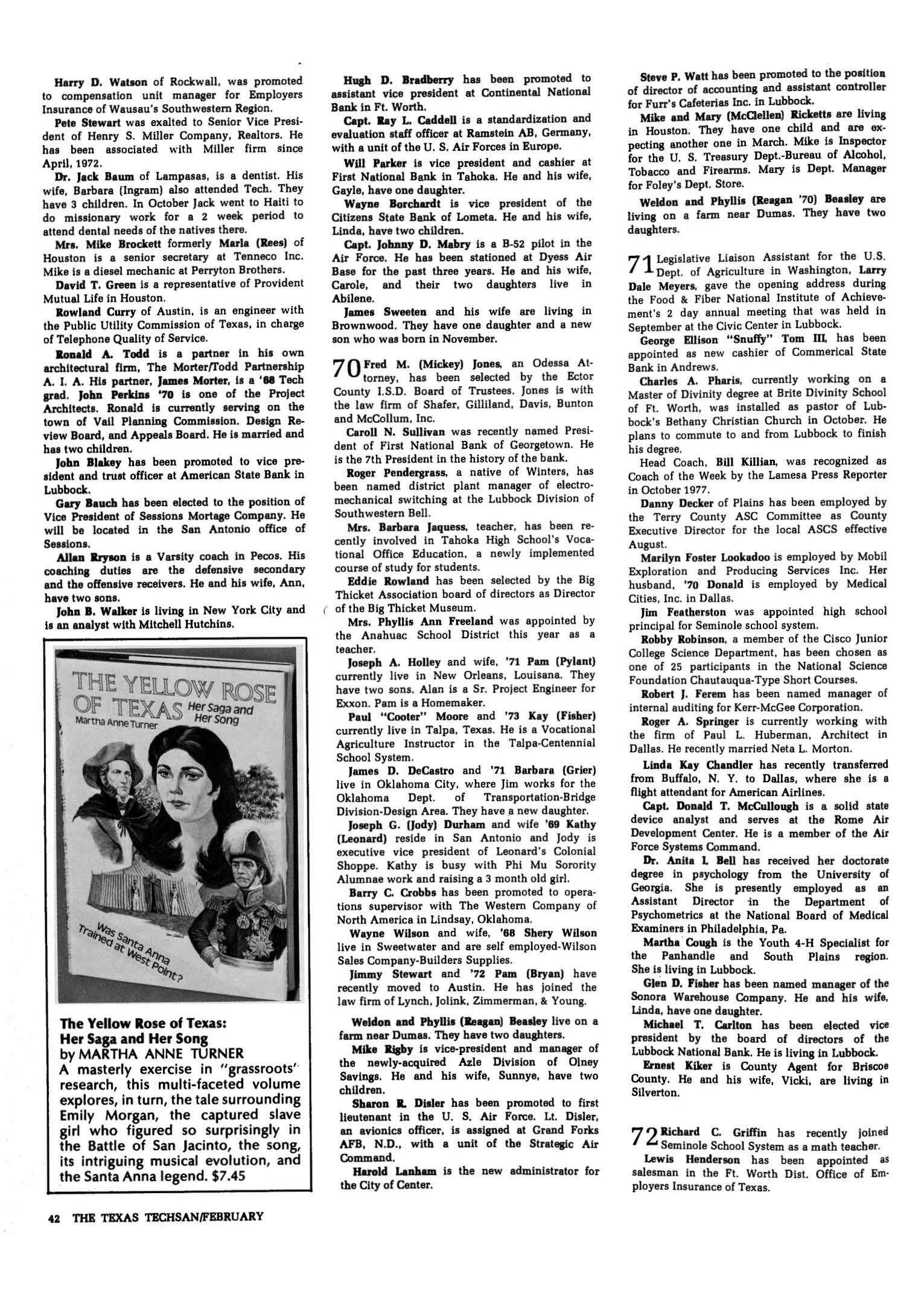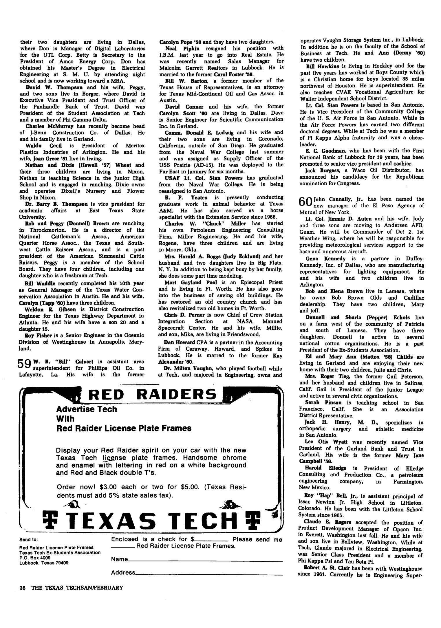 Seco n d-cla ss postaae pa id by The Texu Te cbsan at Lubb ock, Texas Pub lished in February, Apri l, Jun e, August , October and December by the Ex St udents Association of Texas Tech Universit y, P O. Box 4 009, Lubbock, Texas 79409. Subscription rate is $ 10 per year. Chanae o f address should b e sen t to the Association offices 30 days prior to date of issue with which it Is to take effect.