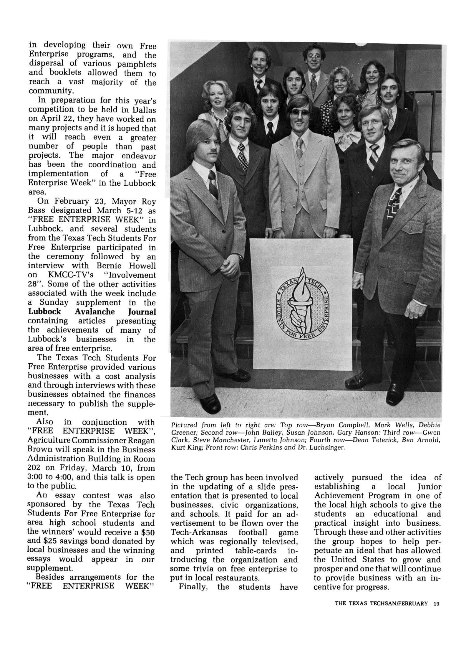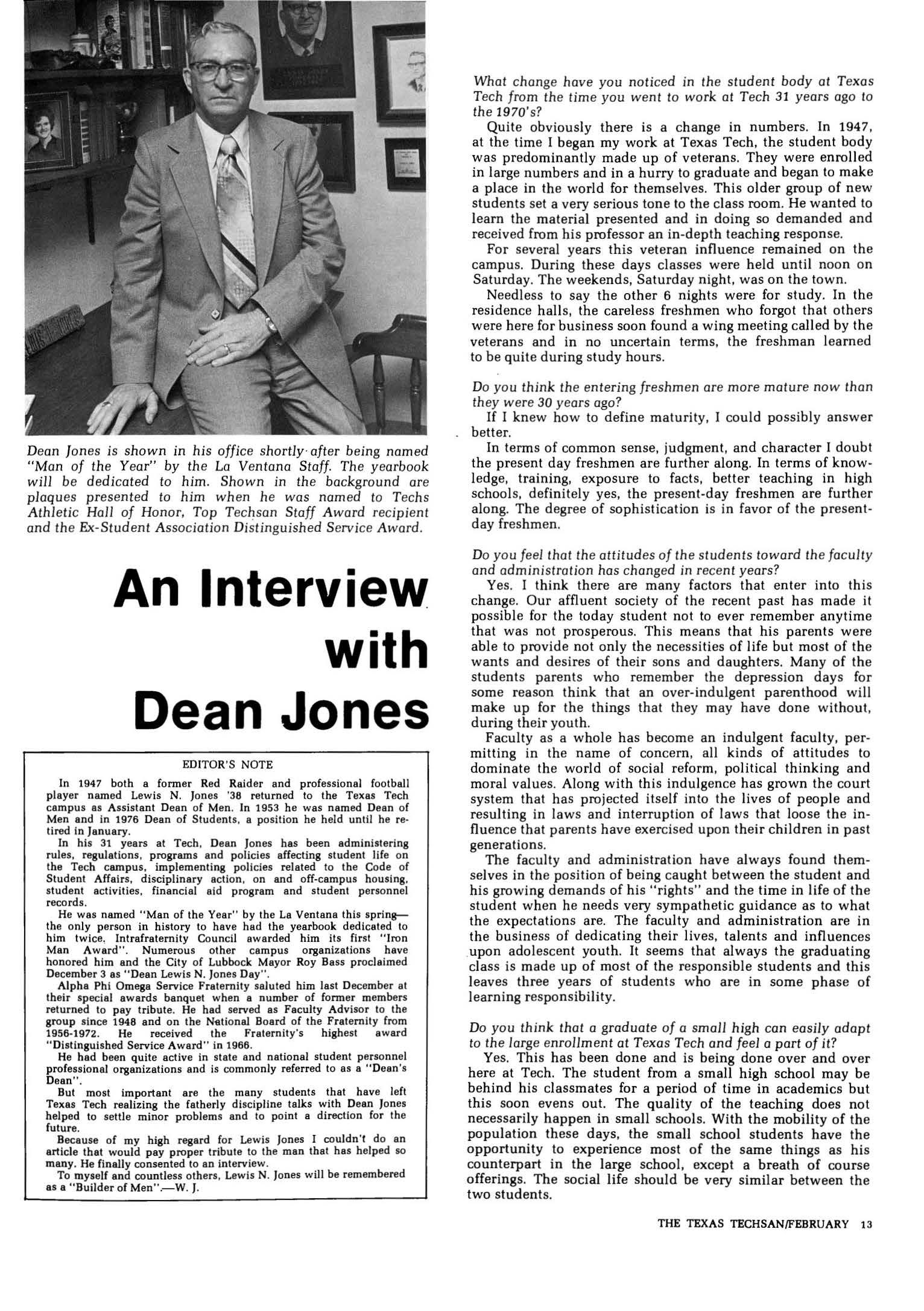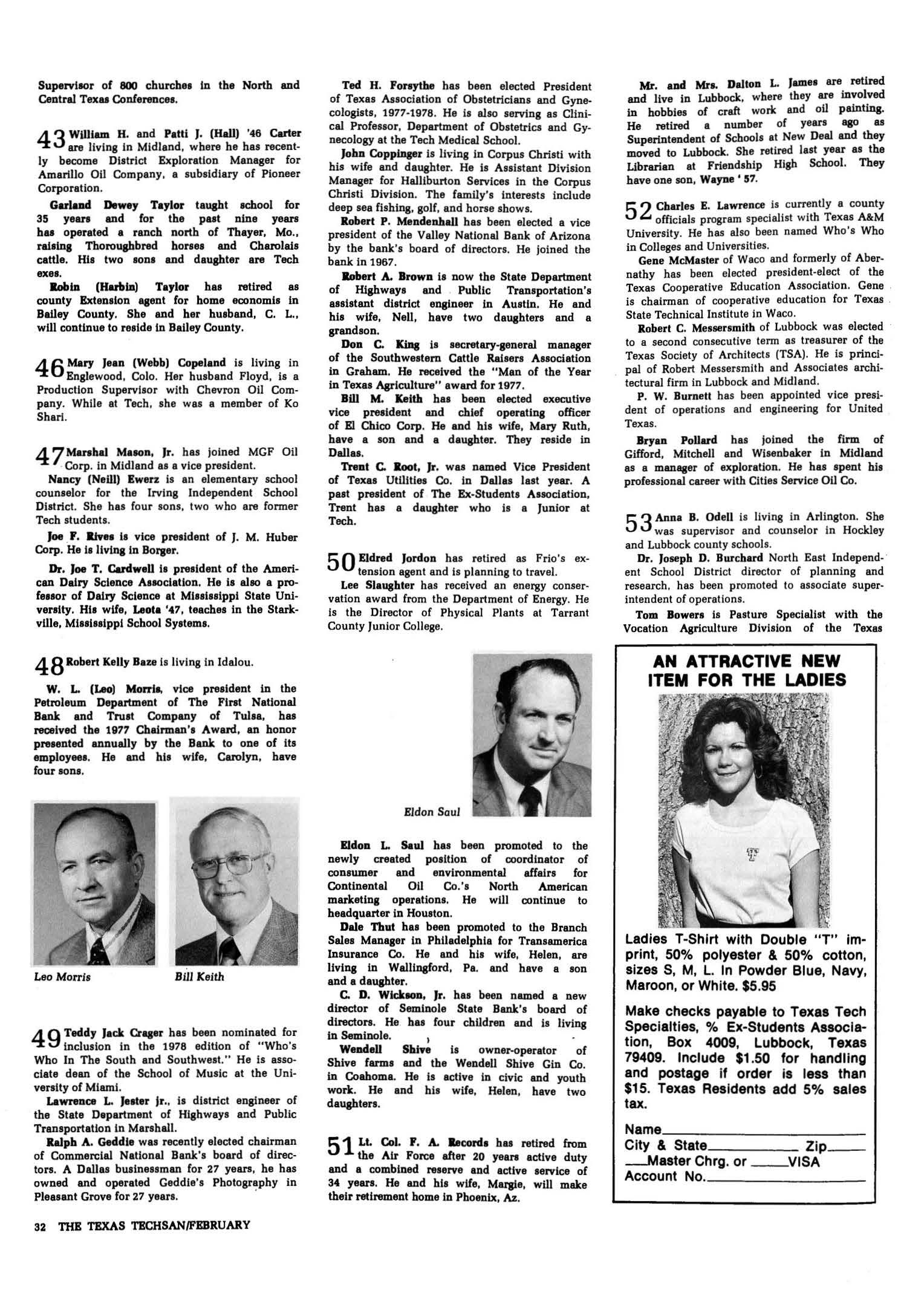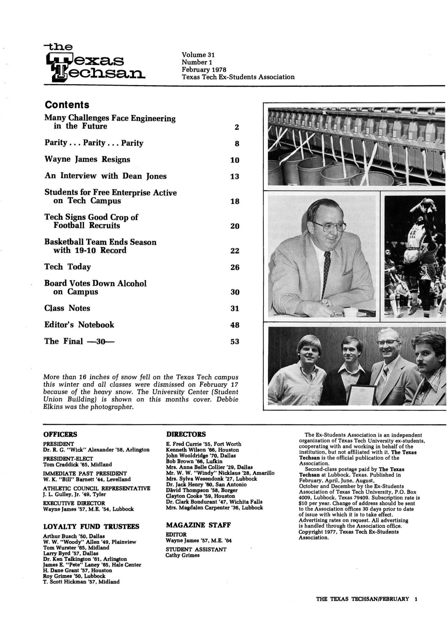 -the 3Eecl:l.san Contents Volume 31 Numbe r1 February 1978 Te xas Te ch Ex-Stude nts A ssoc iation Many Challenges Face Engineering in the Future 2 Parity •.. Parity ... Parity Wayne James Resigns An Interview with Dean Jones Students for Free Enterprise Active on Tech Campus Tech Signs Good Crop of Football Recruits Basketball Team Ends Season with 19-10 Record Tech Today Board Votes Down Alcohol on Campus Class Notes Editor' s Notebook The Final -3o-8 10 13 18 20 22 26 30 31 48 53