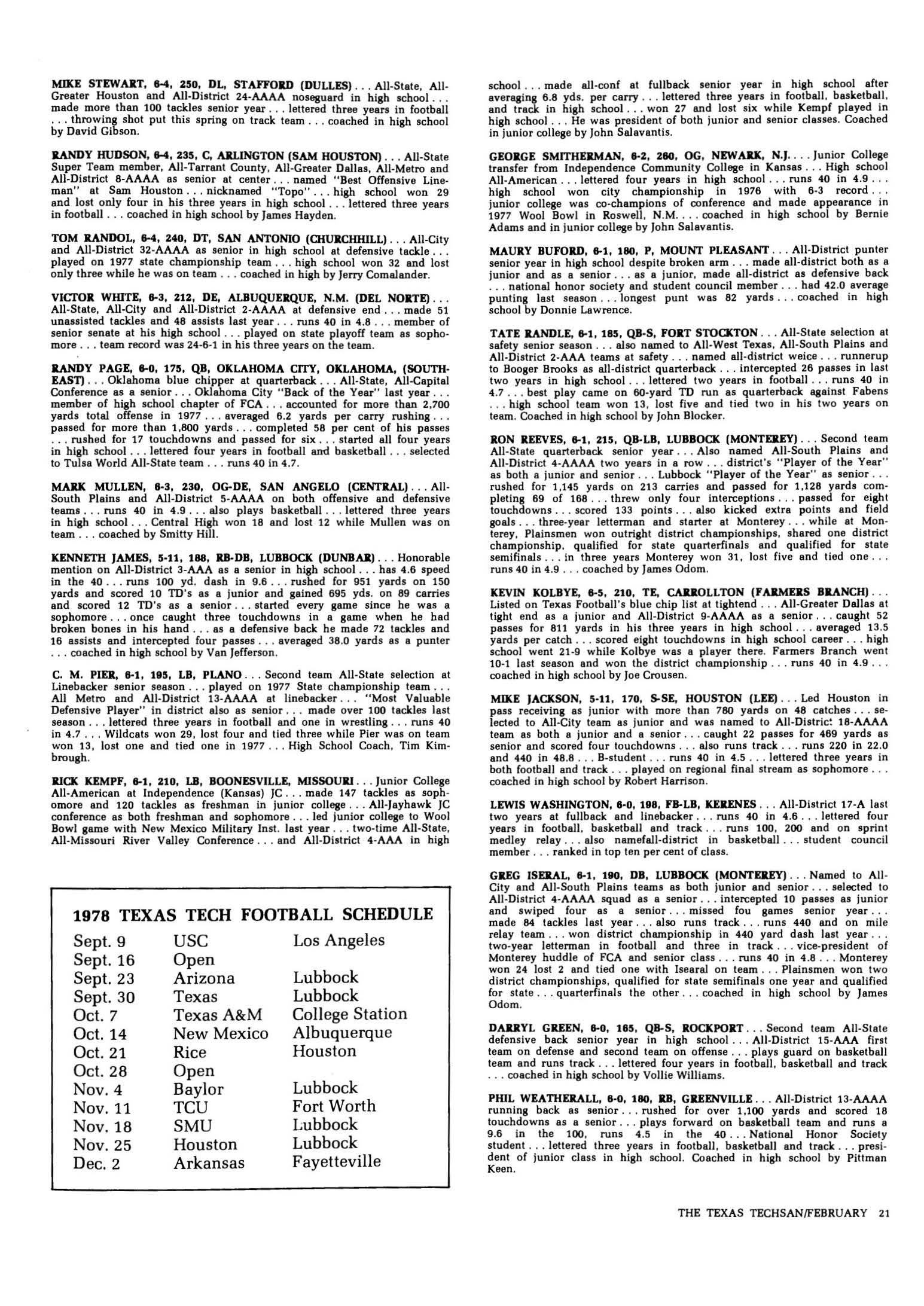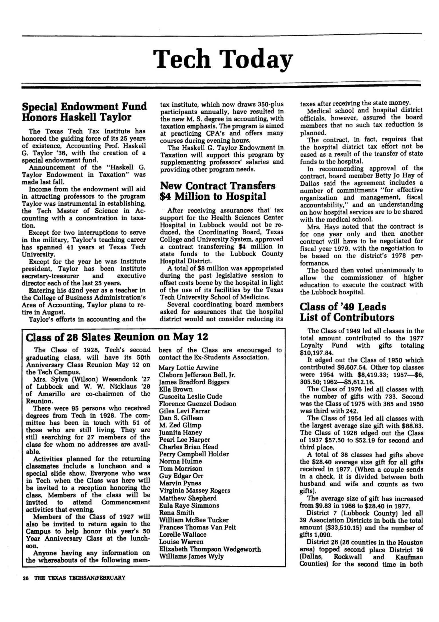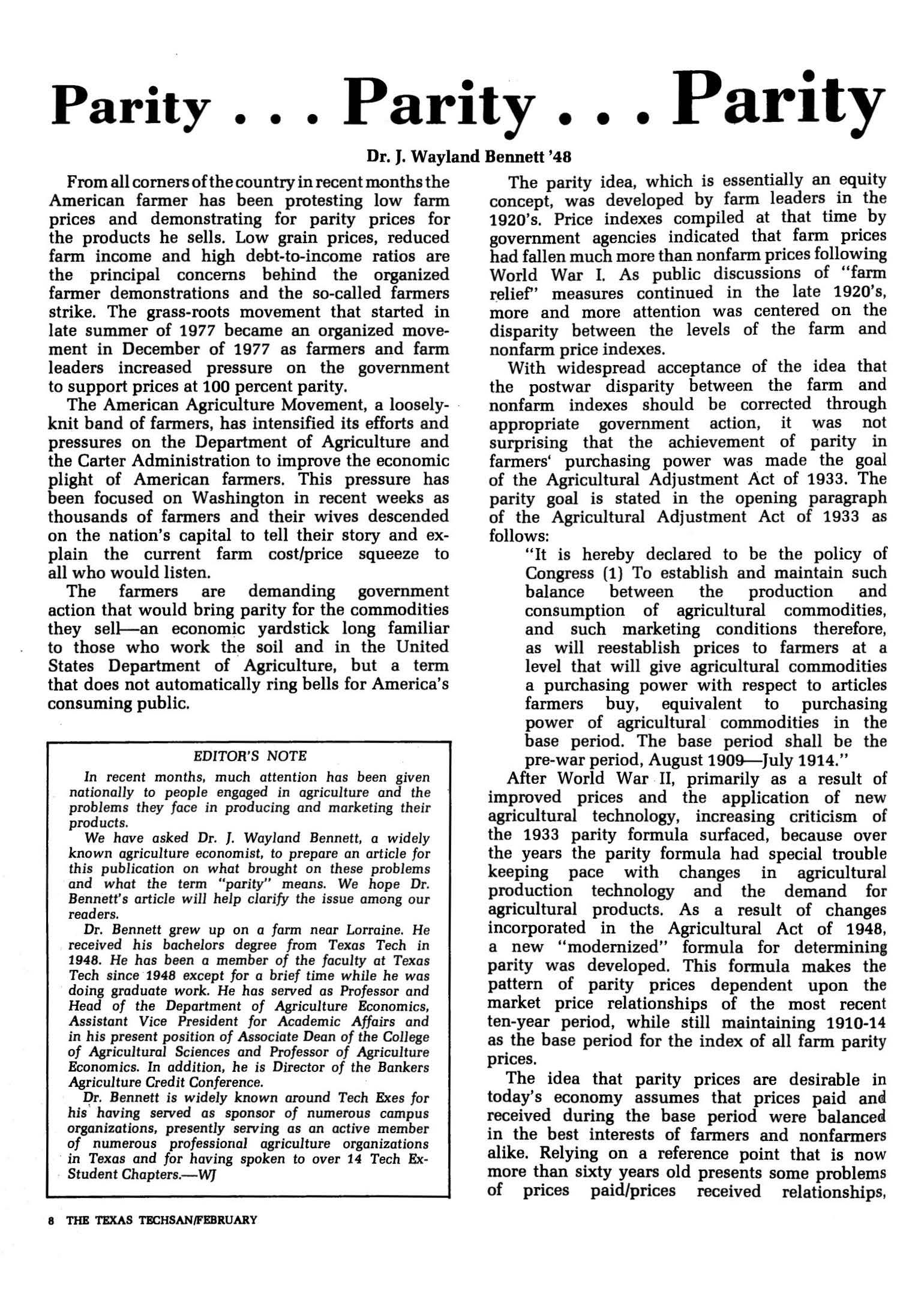 -the 3Eecl:l.san Contents Volume 31 Numbe r1 February 1978 Te xas Te ch Ex-Stude nts A ssoc iation Many Challenges Face Engineering in the Future 2 Parity •.. Parity ... Parity Wayne James Resigns An Interview with Dean Jones Students for Free Enterprise Active on Tech Campus Tech Signs Good Crop of Football Recruits Basketball Team Ends Season with 19-10 Record Tech Today Board Votes Down Alcohol on Campus Class Notes Editor' s Notebook The Final -3o-8 10 13 18 20 22 26 30 31 48 53