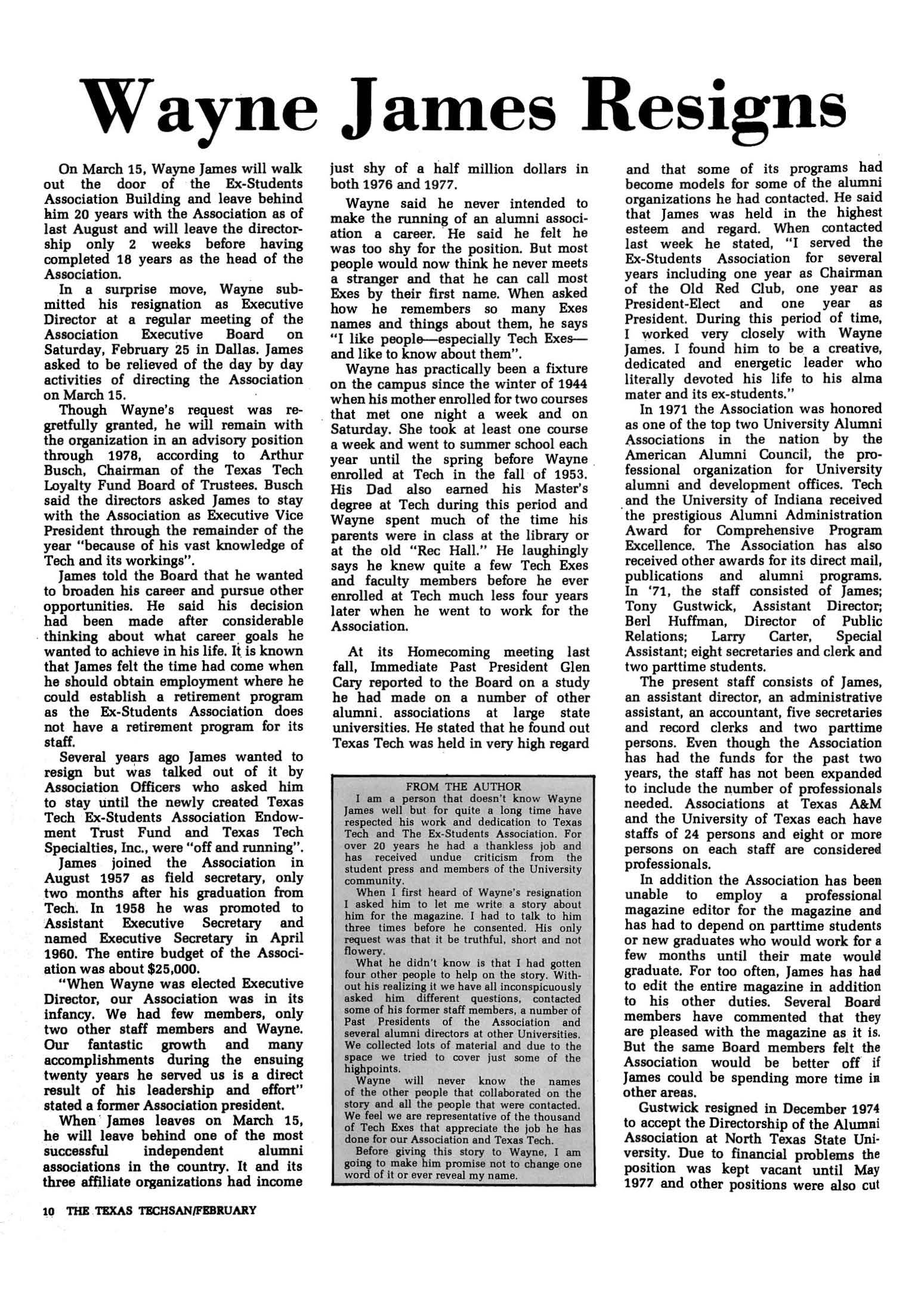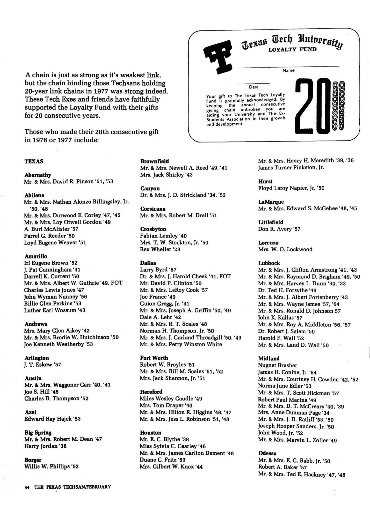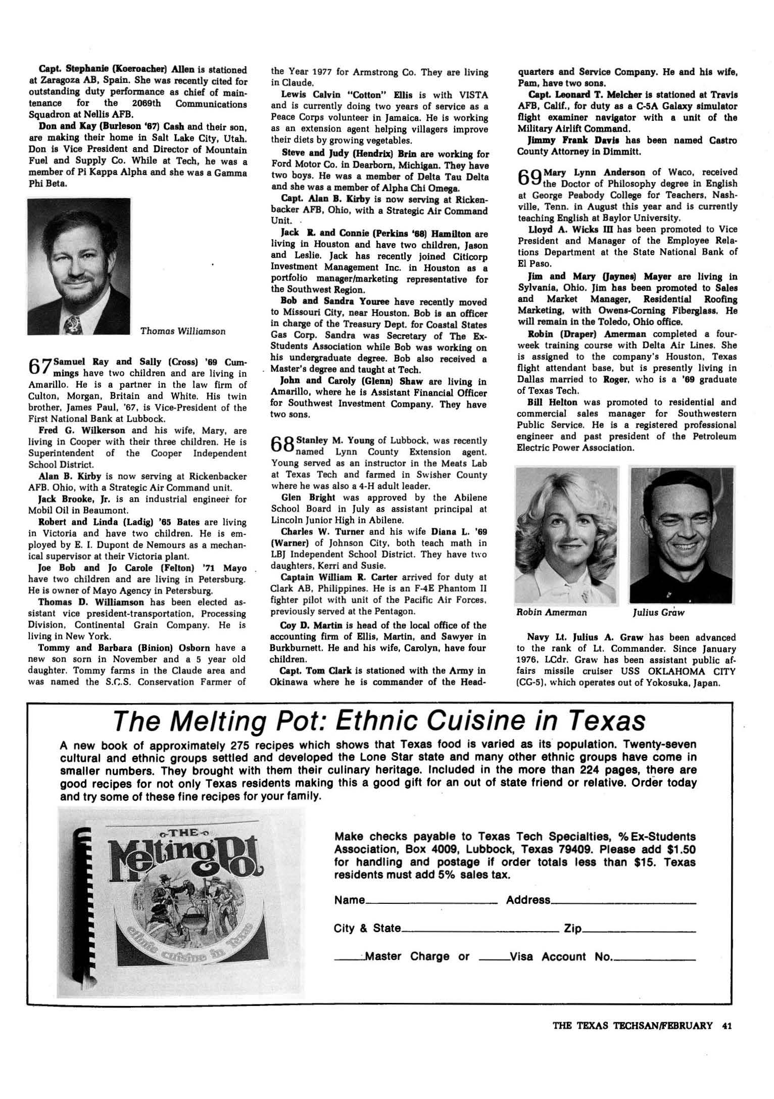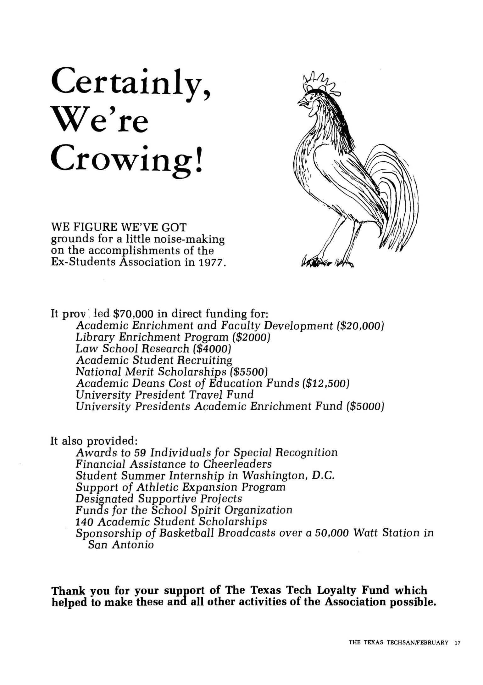 Adve r tis ing rates o n reques t. All a d vertising is hand led through the Associa tion o ffice. Co p yright 1977, Texas T ech Ex Stu den ts Assoc iation